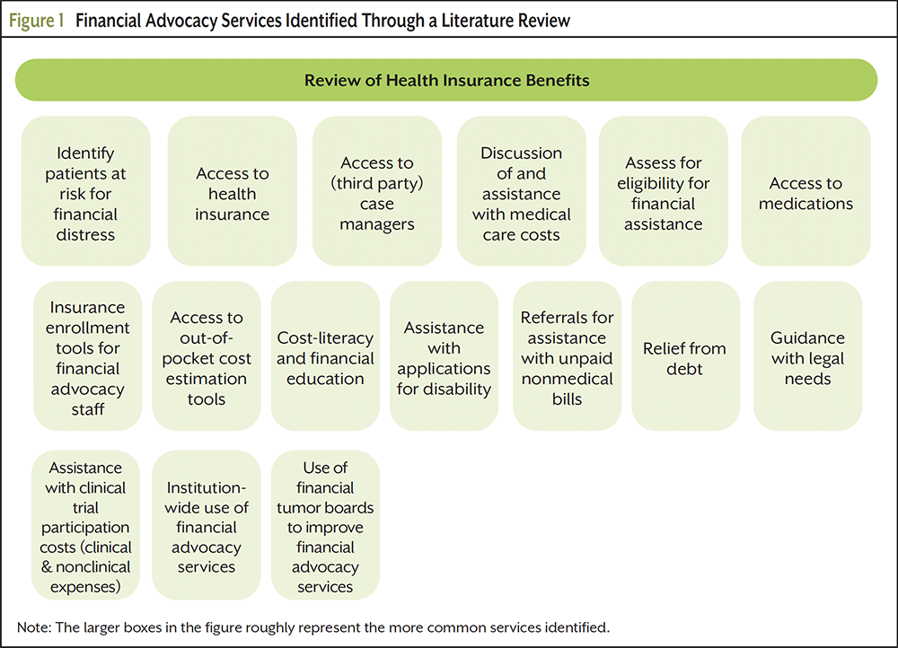 The task force conducted a literature review limited to articles published between January 2016 and December 2021 to capture current evidence. PubMed and Google searches were conducted using the terms “financial advocacy or financial navigation or financial toxicity” and “cancer or oncology.” Articles and studies conducted or describing practices outside the United States were excluded. A total of 55 articles were identified: 21 original research articles, 16 commentaries, 14 reviews, 2 editorials, 1 blog post, and 1 position paper. Figure 1 depicts the financial advocacy services discussed in these articles.