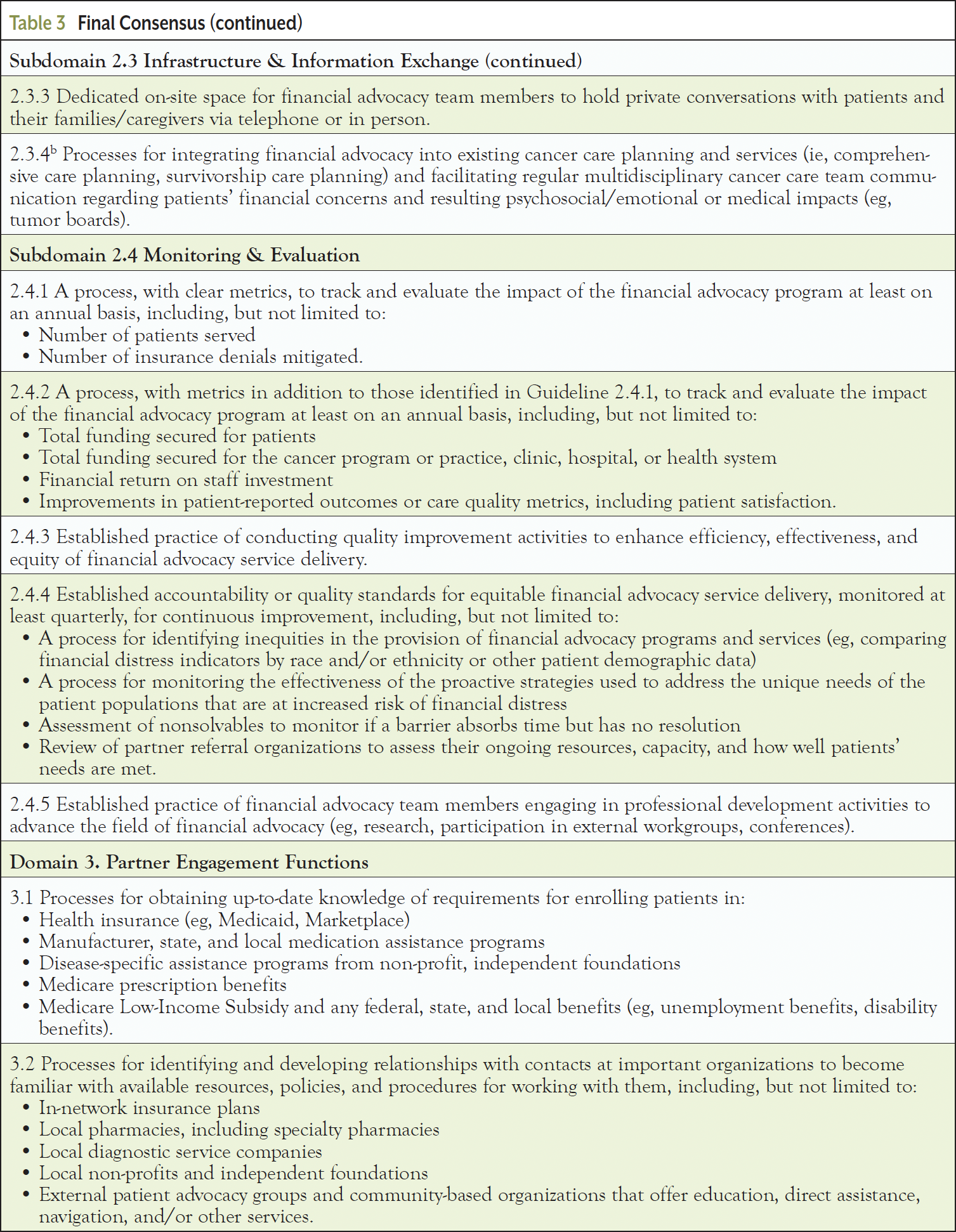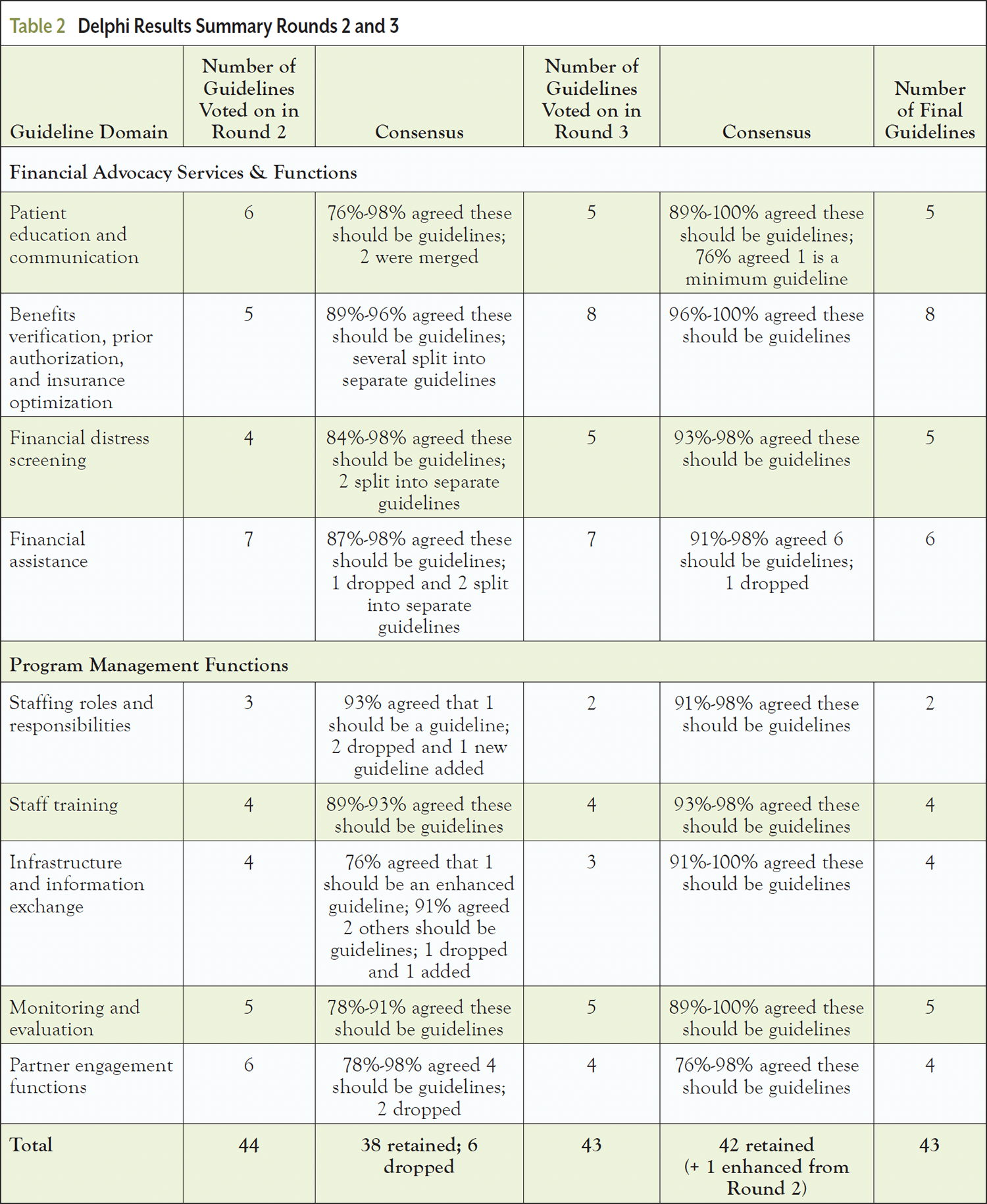 Results: Panelists reached consensus on 43 final guidelines across 3 domains and 8 subdomains: (1) financial advocacy services and functions, (2) program management functions, and (3) partner engagement functions.