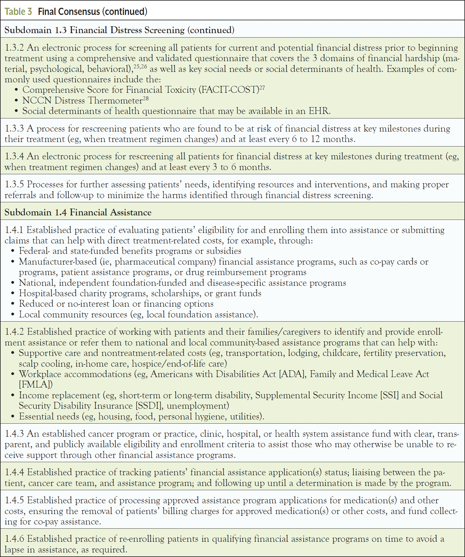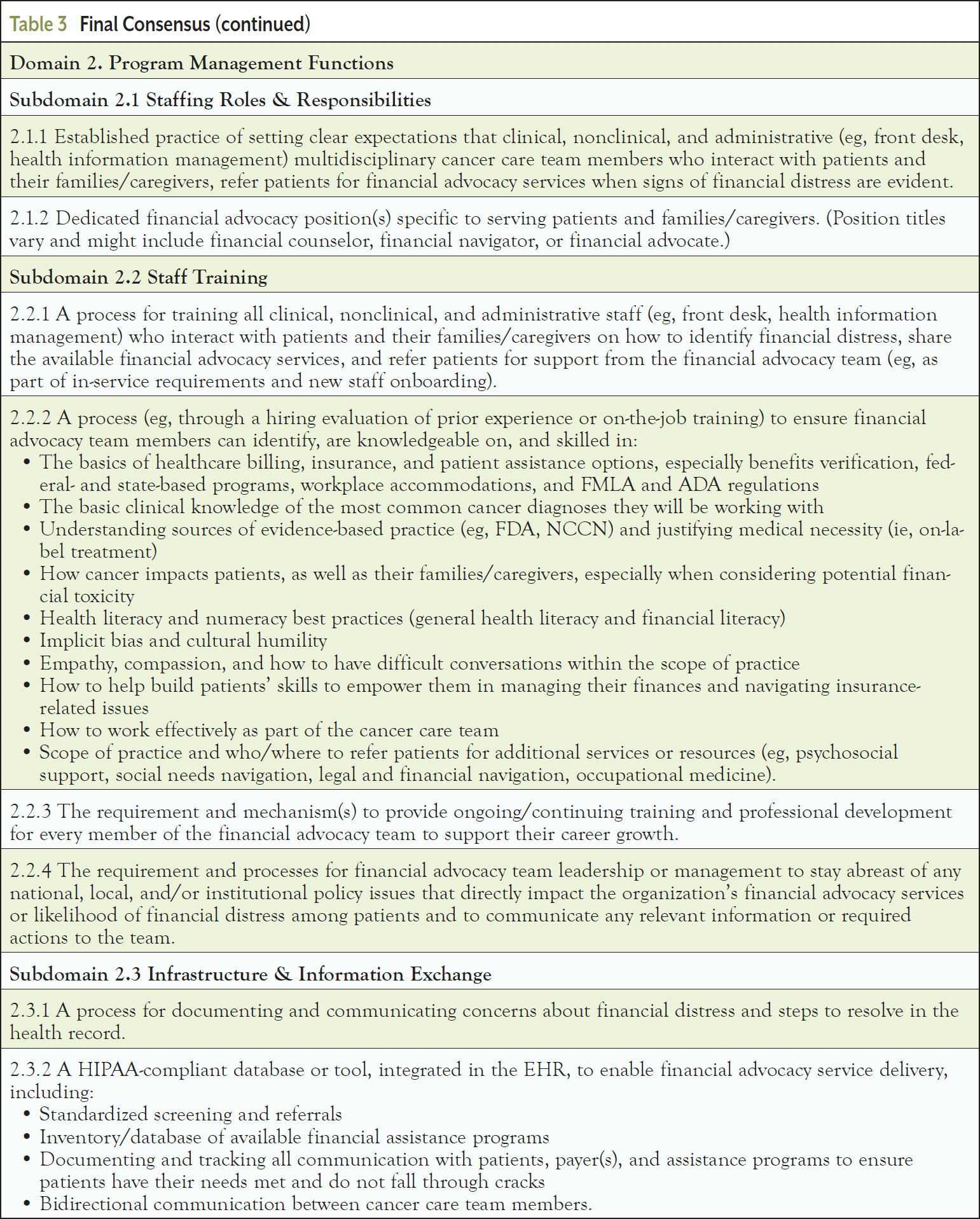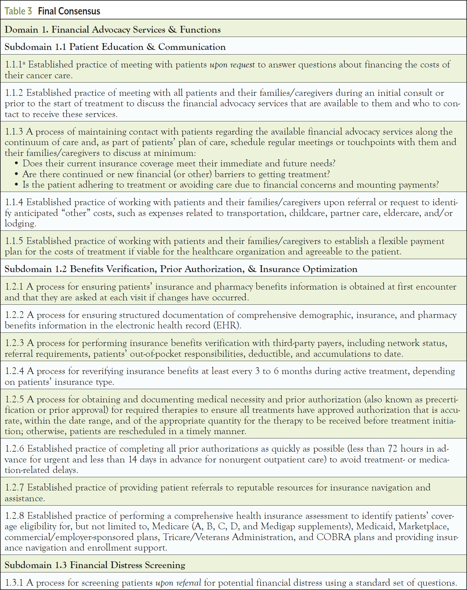Across the 3 rounds, panelists largely agreed on most of the guidelines included in the financial advocacy services and functions domain. Their comments reflected patient-centeredness and urgency for addressing the risks and consequences of financial distress among patients with cancer. The resulting guidelines detail recommended services for patients and their caregivers to mitigate financial distress following a cancer diagnosis. These include supporting patient education and communication, completing financial distress screening, providing benefits verification and insurance optimization, and providing financial assistance. Panelists acknowledged that adherence to these guidelines would depend on available organizational resources. For example, panelists could not reach consensus on the timing and frequency of financial distress screening and rescreening, use of technology solutions to support service delivery and documentation, or feasibility to provide the guidelines’ services to all patients or just a higher-risk subset based on patient request or care team referral.