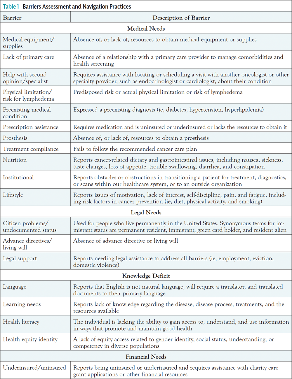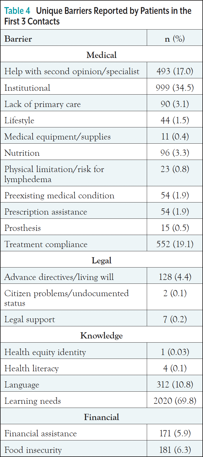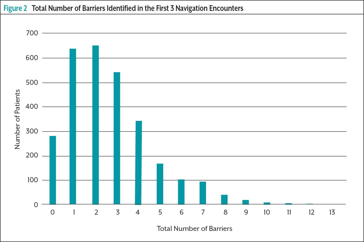 Results: More than half of patients reported up to 3 unique barriers to care in the first 3 navigation encounters, with 98% reporting at least 1. The most common barrier was learning needs, followed by psychosocial issues and obstacles transitioning the patient for treatment within the hospital system or to an outside organization. The most barriers over the first 3 navigation encounters were associated with being female, Black or African American race, Spanish or other unknown primary language, and not being married or partnered.