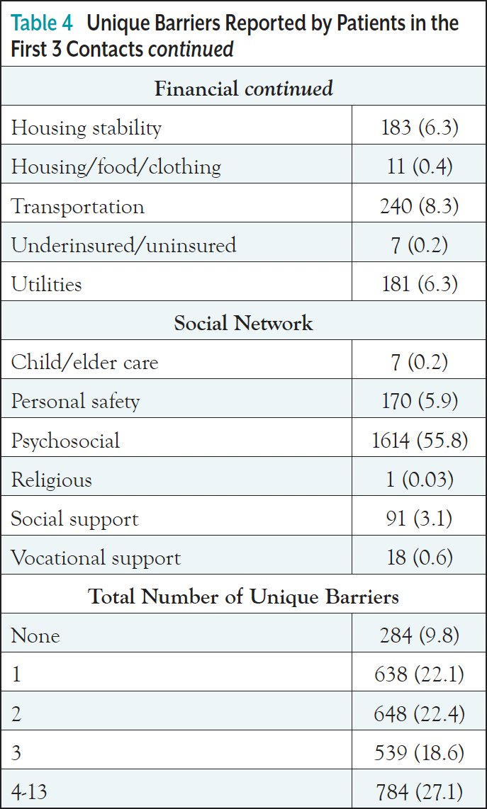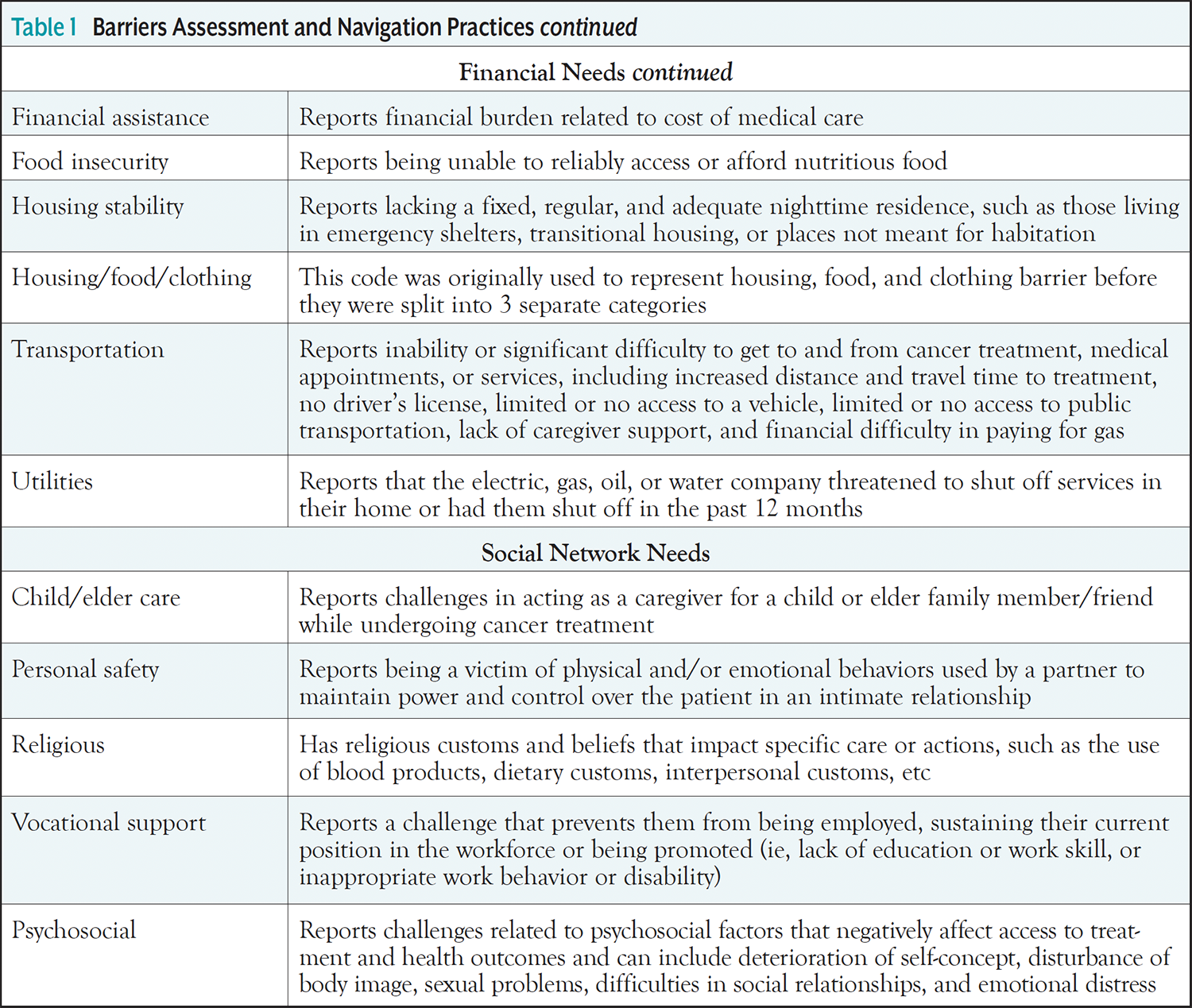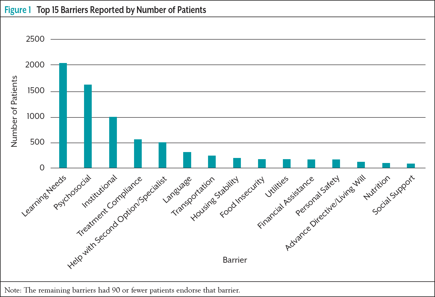 Results: More than half of patients reported up to 3 unique barriers to care in the first 3 navigation encounters, with 98% reporting at least 1. The most common barrier was learning needs, followed by psychosocial issues and obstacles transitioning the patient for treatment within the hospital system or to an outside organization. The most barriers over the first 3 navigation encounters were associated with being female, Black or African American race, Spanish or other unknown primary language, and not being married or partnered.