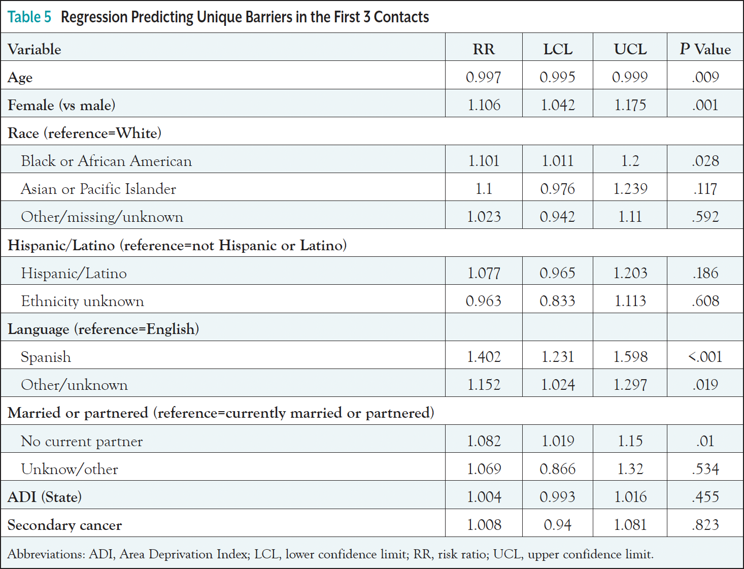 Results of the regression are shown in Table 5. Results indicated that older age was significantly associated with fewer unique barriers over the first 3 navigation contacts (risk ratio [RR]=0.997 per year of age; 95% CI, 0.995-0.999; P=.009). Nonlinear effects of age were considered, but the model’s fit was best with a linear effect. More unique barriers over the first 3 navigation contacts were associated with female sex (RR=1.106; 95% CI, 1.042-1.175; P=.001), Black or African American race compared with White (reference category) (RR=1.101; 95% CI, 1.011-1.200; P=.028), Spanish as primary language (RR=1.402; 95% CI, 1.231-1.598; P<.001), other or unknown primary language (RR=1.152; 95% CI, 1.024-1.297; P=.019), and not being married or partnered (RR=1.082; 95% CI, 1.019-1.15; P=.01). No significant associations were observed for Hispanic ethnicity, ADI, or having cancer spread to secondary site(s).