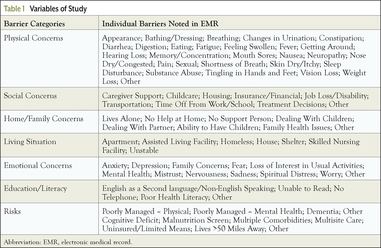 In 2017, the Academy of Oncology Nurse & Patient Navigators (AONN+) published 35 evidence-based navigation standard metrics that navigation programs are suggested to track.3 An exploratory study approved by an institutional review board (IRB) followed that examined 10 of the identified metrics in additional detail.4 Results from this study indicated the following 5 core metrics were applicable across 8 varied study sites: (1) barriers to care, (2) navigation caseload, (3) psychosocial distress screening, (4) social support referrals, and (5) navigator competencies. As a result, these 5 identified metrics were suggested as those directly influenced by oncology navigators and which did apply to any program.4 The outcome confirmed the important focus on barriers to care for any navigation program seeking to define its impact in meeting patient needs. To add to this body of knowledge, the current study focused specifically on barriers to oncology treatment as they relate to oncology navigation outcomes of care.