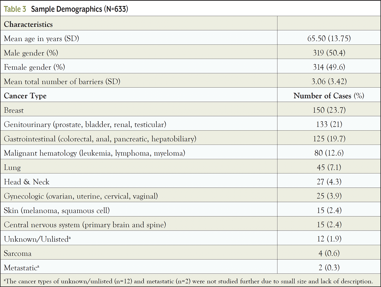 The sample comprised retrospective chart data from 633 adult patients with cancer seen in an outpatient oncology navigation program across 3 clinics in suburban Colorado. The program manages over 2500 patients annually, is staffed by ONNs with a minimum of a BSN degree, and serves patients from northern Colorado, southern Wyoming, and western Nebraska. These patients had either a new diagnosis of cancer or a new diagnosis of recurrent cancer. Sample demographics are displayed in Table 3.