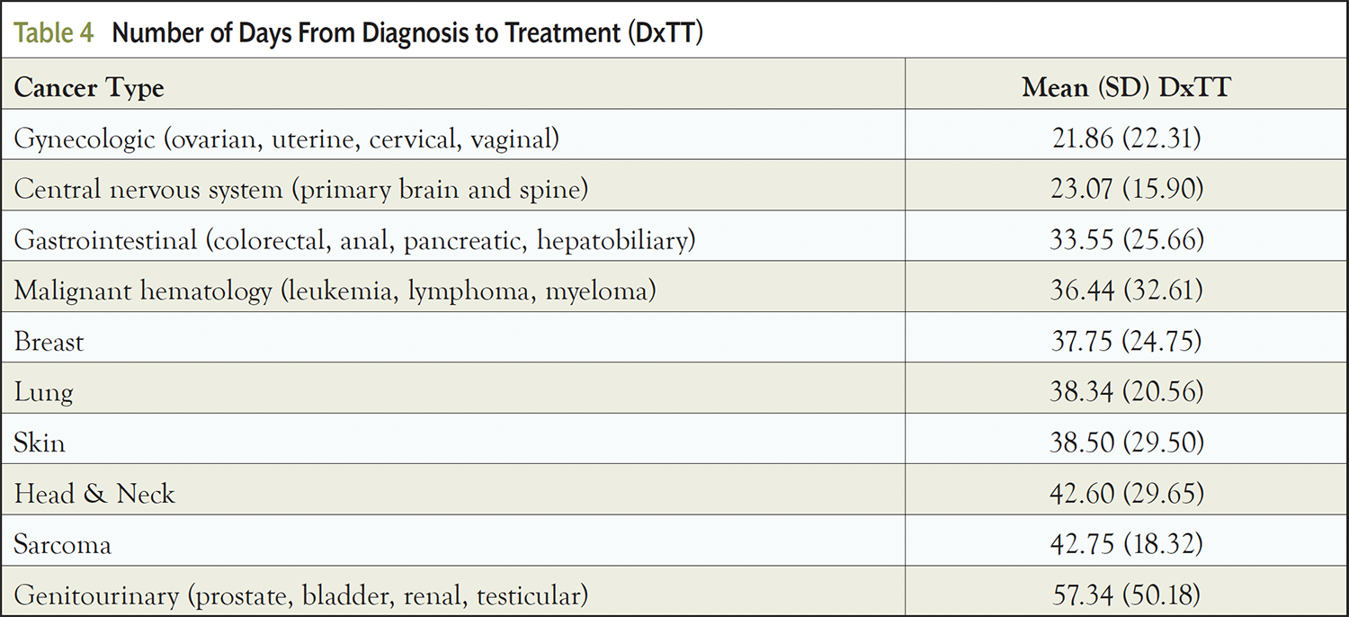 On initial analysis, there was a statistically significant association (P=.003) between patient gender and DxTT: an average of 35.82 days (SD=26.02) for females and 44.11 days (SD=39.47) for males. When further examined, this difference was found to result from type of cancer (P<.001) rather than gender. As shown in Table 4, those with gynecologic cancers had the shortest duration of DxTT (21.86 days), while patients with genitourinary (GU) cancers had the lengthiest (57.34 days). This result is not unusual as there are some cancers where a biopsy is not performed due to risk to the patient. This means the “date of diagnosis” and “date of first treatment” are the same. Such situations could include removing an ovarian mass to make a diagnosis, removing a brain tumor due to symptoms, or performing abdominal surgery for relief of a colon blockage.