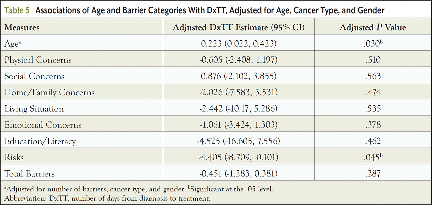 After adjusting for number of barriers, cancer type, gender, and age was found to be significantly associated with DxTT (Table 5). For each additional year of age, patients started treatment 0.223 days later (P=.03). Often, ONNs see cancers in younger patients at later stages or with a more aggressive biology,15,16 and therefore the care team works diligently to initiate treatment. However, it should not be overlooked that older patients appear to begin treatment later than their younger counterparts.