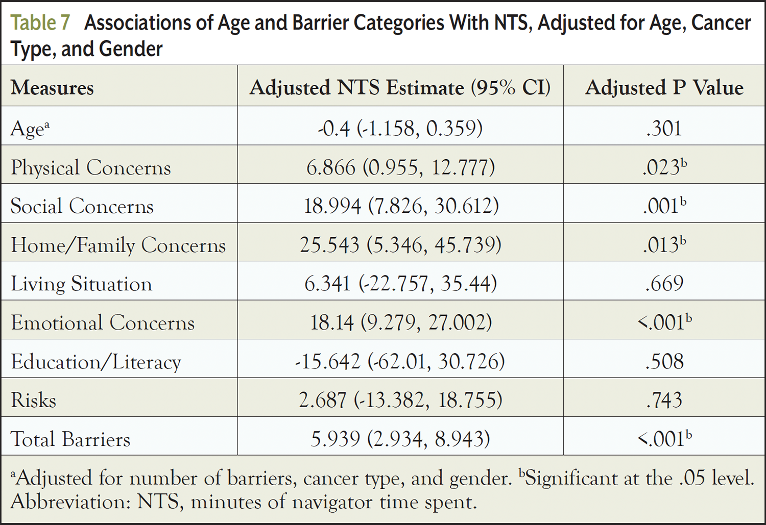 The 5 barrier categories significantly associated with NTS (Table 7) were Physical Concerns (P=.023), Social Concerns (P=.001), Home/Family Concerns (P=.013), Emotional Concerns (P<.001), and Total Barriers (P<.001). The increase in time was largest in the Home/Family Concerns category, as an additional 25.54 minutes were spent with the ONN for each barrier identified within this category. For each physical concern identified in a patient, an average of 6.87 extra minutes was spent; for each social and emotional concern, 18.99 and 18.14 additional minutes were spent, respectively; and for each barrier (Total Barriers), an average of 5.94 minutes was spent with an ONN irrespective of barrier category. These additional amounts of time needed with a navigator are not only significant and noteworthy findings but also underscore that navigator time must be proportional to identified barriers for effective and comprehensive navigation.