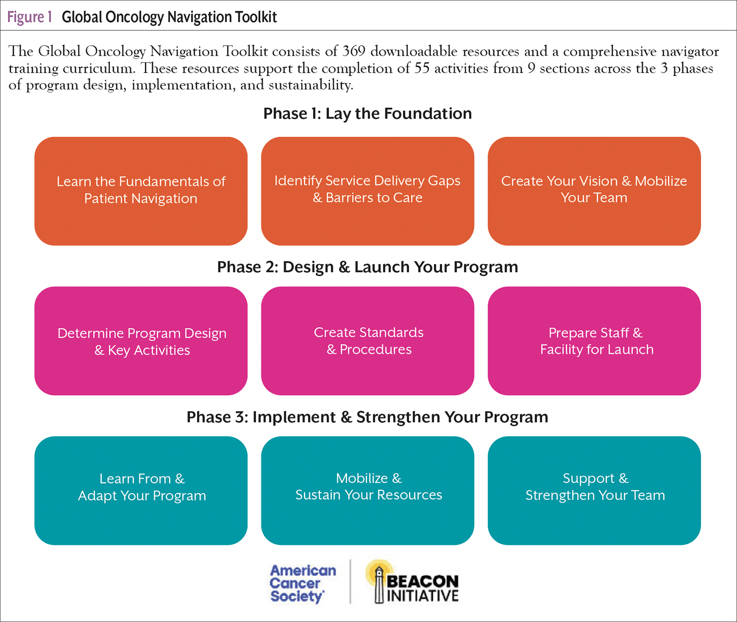 The Global Oncology Navigation Toolkit focuses primarily, but not exclusively, on the cancer treatment phase, and specifically on the universal ‘how-tos’ of PN program design, implementation, and sustainability (Figure 1). Recognizing that PN can enhance the ability of healthcare systems to adapt to emerging patient needs and challenges, the Toolkit uses a health systems’ strengthening approach9 to support sustainably embedding navigation into broader cancer care delivery systems, accounting for referral pathways to other levels of care and leveraging community-based resources for patient and caregiver support. It provides practical, adaptable, self-service resources coupled with a self-paced approach for maximum flexibility. It also features an adaptable navigator training curriculum.