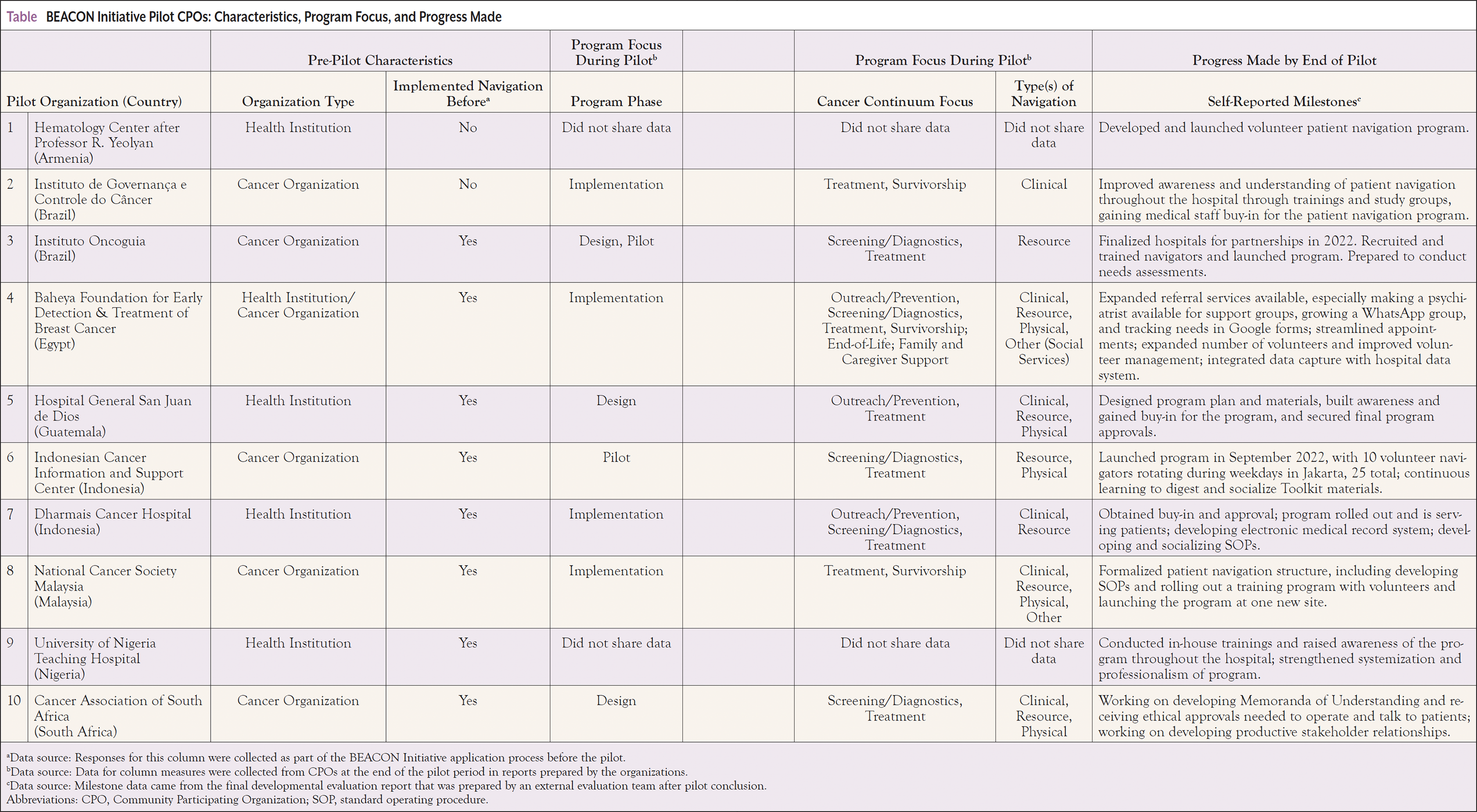 We piloted the Global Oncology Navigation Toolkit and other offerings with 10 Community Participating Organizations (CPOs) from 8 countries from February 2022 to May 2023. Pilot CPOs varied by location, institution type, and in their prior experience with PN (Table).