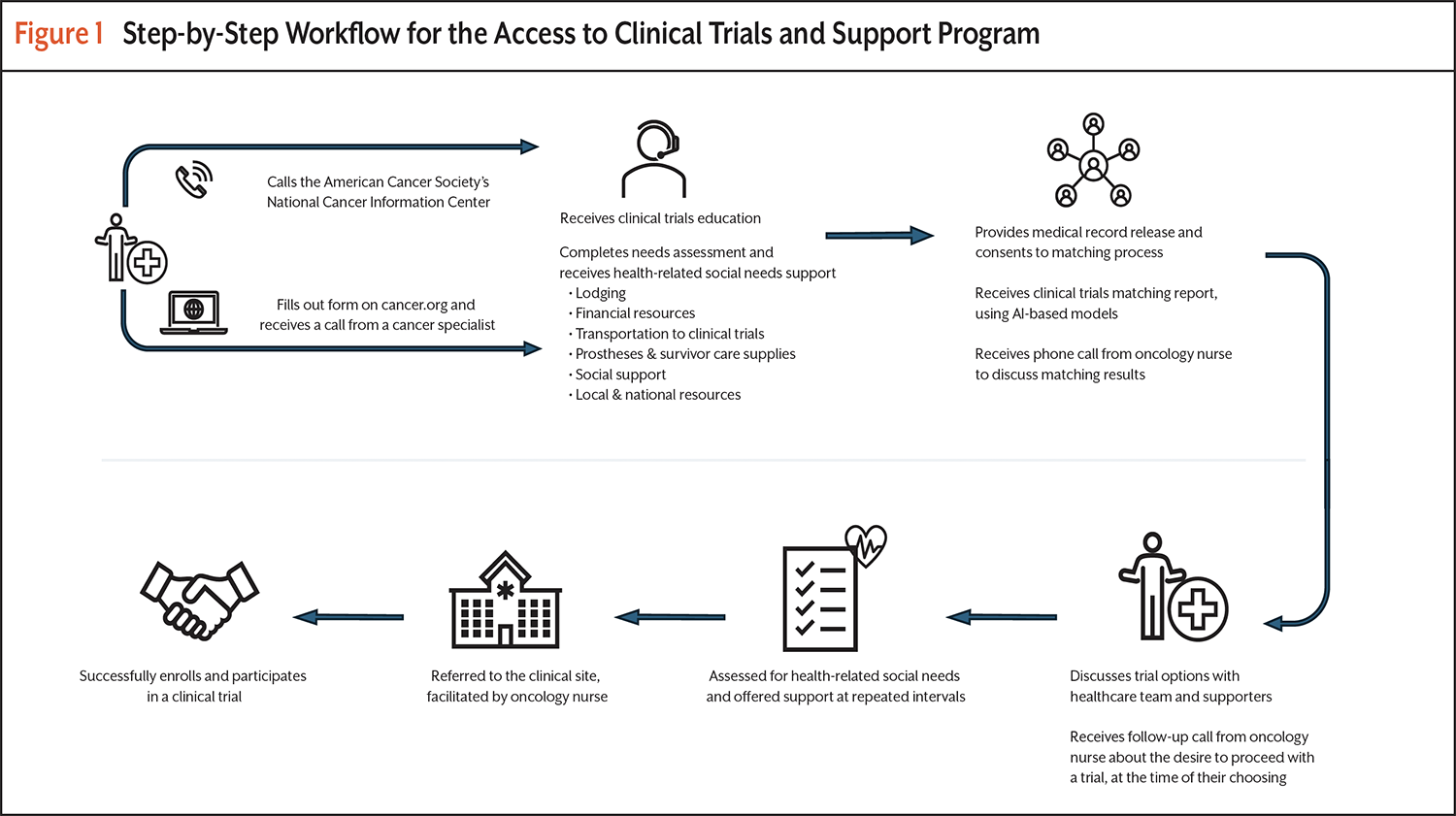 Recognizing the combined power of technology and person-based navigation, ACS launched the Access to Clinical Trials and Support (ACS ACTS) program in February 2025. ACS ACTS leverages AI-driven clinical trial matching to connect patients to personalized clinical trial opportunities while providing comprehensive wraparound support to address health-related social needs (HRSNs; Figure 1). Through ACS ACTS, patients receive clinical trial education, HRSN screening, and assistance with transportation, lodging, and other social needs. Patients, caregivers, and healthcare professionals can access the program by calling the ACS National Cancer Information Center at 800-227-2345, available 24 hours a day and 7 days a week, or by completing the intake form on the program website.