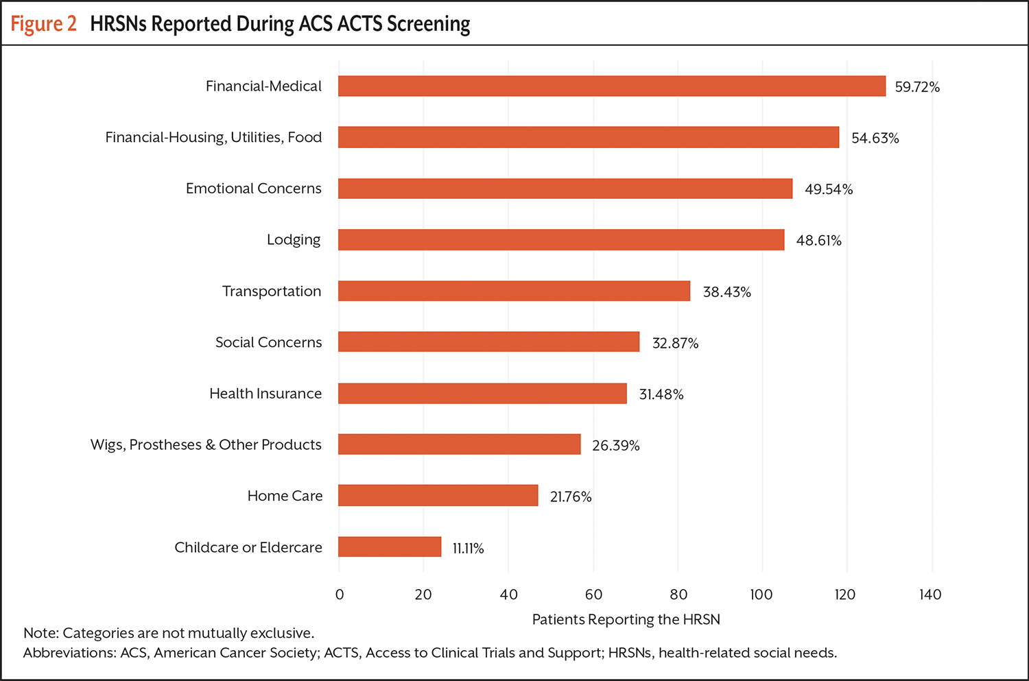 ACS ACTS was launched as a pilot for people who reside in or will travel to receive care in the northeast United States (Connecticut, Delaware, Maine, Maryland, Massachusetts, New Hampshire, New Jersey, New York, Ohio, Pennsylvania, Rhode Island, Vermont, Virginia, West Virginia, and Washington, DC). In its first 9 weeks (February 24-April 25, 2025), 299 individuals engaged with the ACS ACTS program, and 216 completed the 1-item HRSN screening question. During this period, 809 health-related social needs were identified, with the top 5 needs being financial needs related to medical care (n=129, 59.72%); financial needs related to housing, food, or utilities (n=118, 54.63%); emotional concerns (n=107, 49.54%); lodging (n=105, 48.61%); and transportation (n=83, 38.43%; Figure 2). These findings emphasize the importance of addressing HRSNs alongside clinical trials education and coordination.