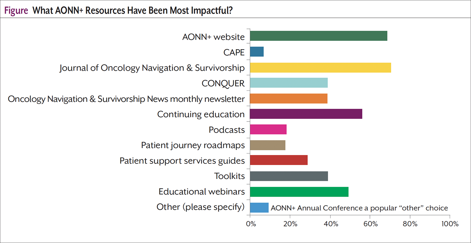 The threads of employment, compensation, and caseload were reflected in the question of what topics the membership would like to receive more information about. Metrics, financial support, reimbursement, and sustainability were the top-ranking choices. Professional development was also a popular request and was inclusive of standards in a navigation program, team empowerment with a networking focus, sharing best practices on how navigators work in various systems (referral process), and self-care by understanding compassion fatigue. Clinical trials were not a popular choice by the respondents, and further exploration showed that only 22% from this survey were directly involved in clinical trial education or recruitment. But 80% stated they were comfortable talking to patients about clinical trials and had support to be active with the facility’s clinical trials team. Clinical Trial Education for the Navigator is a 2024 AONN+ resource that focused on helping all navigators understand clinical trial protocols, accrual, and retention best practices. The ranking of resources that have been impactful for AONN+ membership is shown in the Figure.