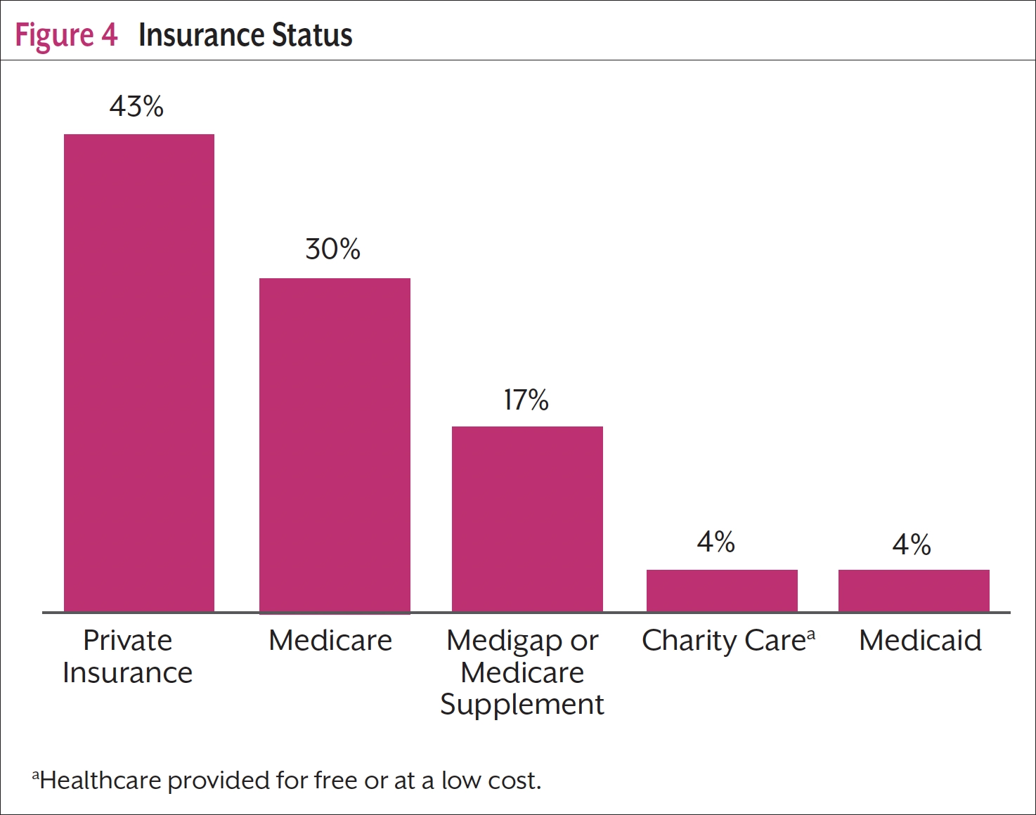 All participants had health insurance (Figure 4). The largest group of participants (43%) had private health insurance, 30% had Medicare, 17% had Medicap or a Medicare Supplement, 4% had Medicaid, and 4% were recipients of Charity Care. No participants were insured through the Veterans Affairs program, had unknown insurance, or were uninsured.