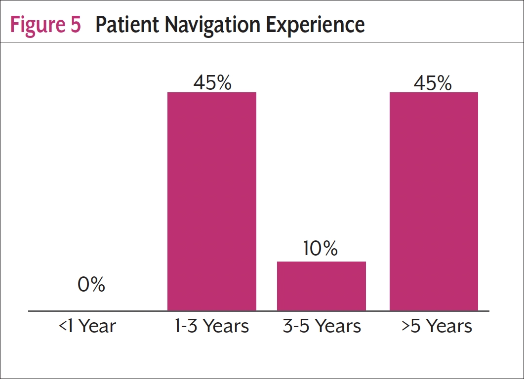 All patient navigator participants had at least 1 year of work experience (Figure 5). Almost half (45%) had 1 to 3 years of experience, 10% had between 3 and 5 years of experience, and 45% had more than 5 years of experience.
