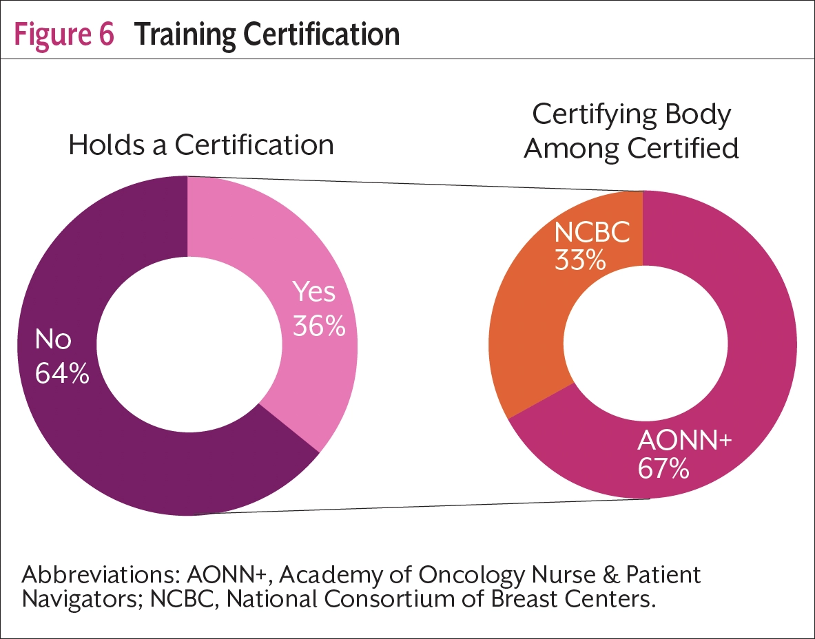 Patient navigators were asked about any certifications they held (Figure 6). Most (64%) did not have a patient navigation training certification. Of the 36% of participants with certification, 67% were certified through AONN+ and 33% were certified through the National Consortium of Breast Centers.