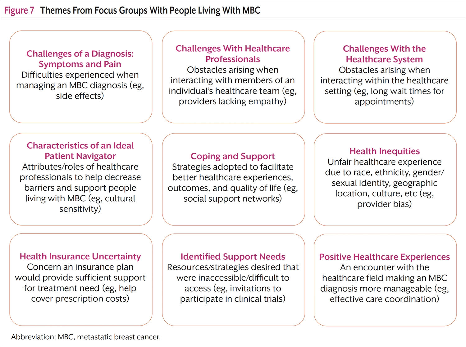 Results: Analysis of 4 focus groups of people living with MBC (n=17) yielded 9 themes: positive healthcare experiences; challenges of diagnosis: symptoms and pain; challenges with healthcare professionals; challenges with the healthcare system; health insurance uncertainty; health inequities; coping and support; characteristics of an ideal patient navigator; and identified support needs. Analysis of 3 patient navigator focus groups (n=11) yielded 9 themes: role of patient navigators, navigation success stories, navigation strategies, helpful navigation resources, navigator needs, barriers to navigation, challenges within the healthcare system, descriptions of an ideal patient navigation training, and unique navigation needs for people living with MBC.