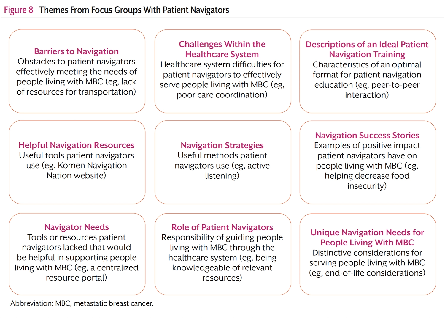 Patient navigation has also been shown to improve cancer care, specifically breast cancer care, for marginalized and underserved patients, including improved screening rates,13 time from screening to diagnosis and diagnosis to treatment,9 and quality of life.10 However, research on the readiness of patient navigators to serve people living with MBC is lacking.