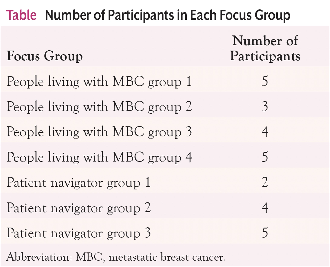 Methods: Two phases of focus groups with people living with MBC (phase 1) and patient navigators (phase 2) were conducted. Data from those focus groups were analyzed using a constant comparison approach.