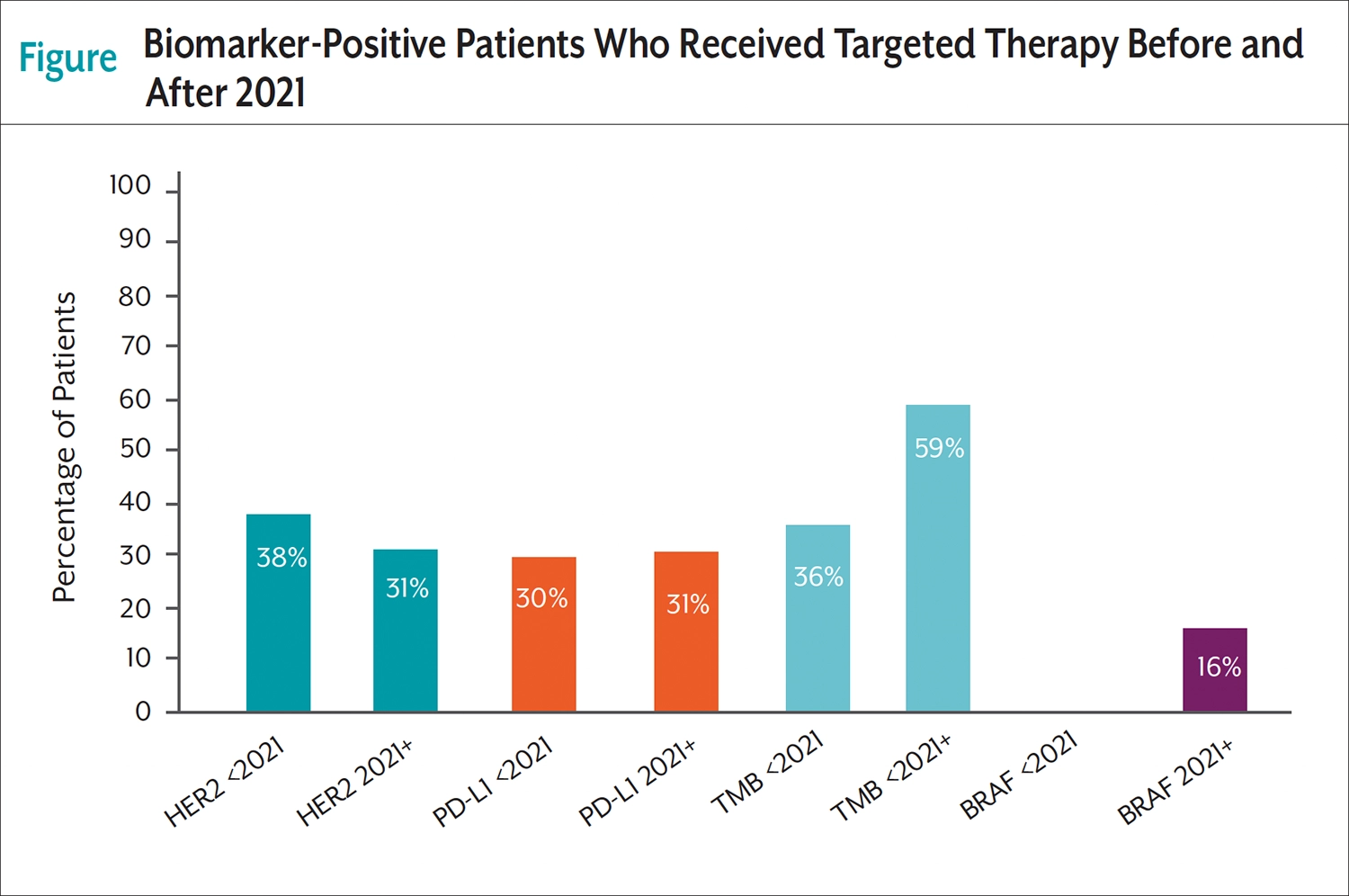 Before 2021, 76% of patients with gastric cancer were tested for biomarkers; after 2021, 69% of patients with gastric cancer were tested for biomarkers. HER2 (<2021, 69%; 2021+, 65%) and PD-L1 (<2021, 25%; 2021+, 28%) biomarkers were found most frequently. The Figure shows the percentage of patients who were biomarker positive and received targeted therapy before and after 2021. Mentions for targeted therapy were found for 4 biomarkers: HER2, PD-L1, TMB, and BRAF. The number of patients who were biomarker positive and on a targeted therapy was low—between 30% and 38% before 2021 and 16% and 59% after 2021—with the majority of patients on targeted therapy for HER2- and PD-L1–positive disease.