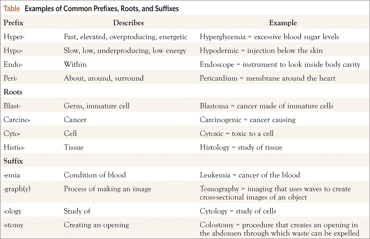 Many medical terms are derived from Greek or Latin words. The prefix of the word describes the size, location, direction, or amount. The root of the word determines which body part the word relates to. The key to understanding medical terms is breaking down the words (Table).
