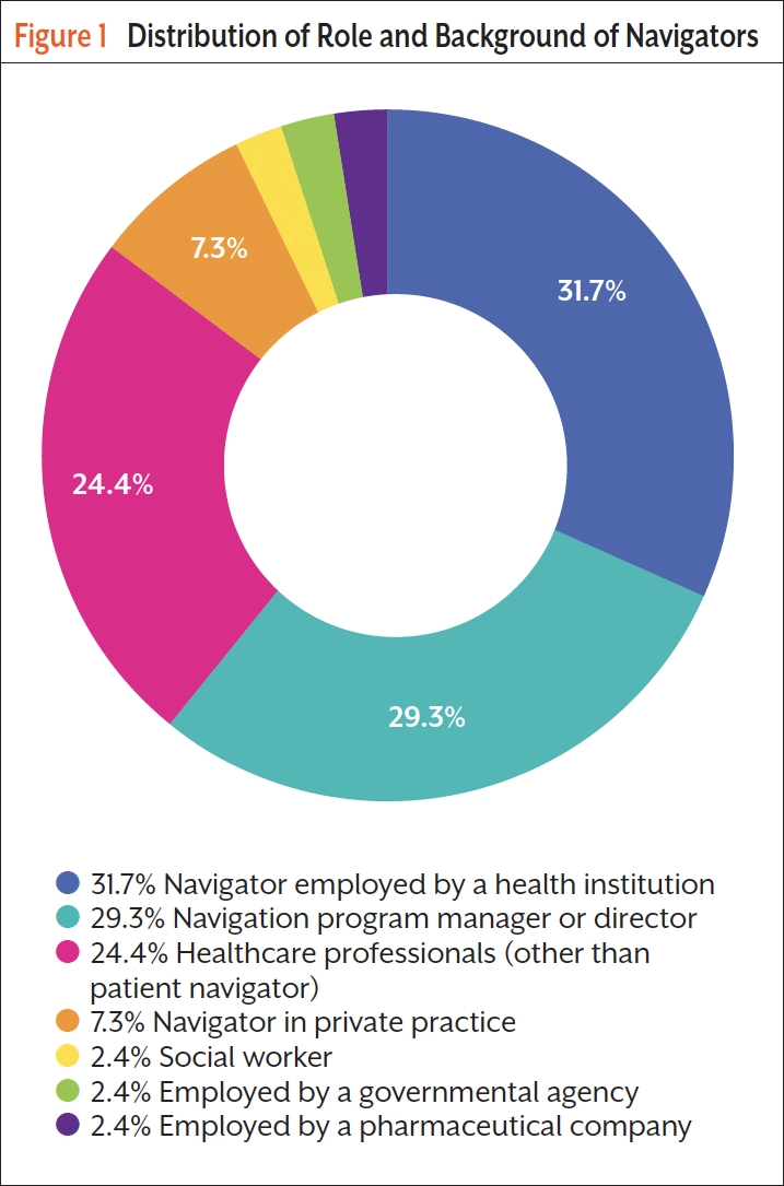 According to the survey, there is a variety in the affiliation of navigators. Most navigators are institutional, affiliated with health institutions or navigation programs. But there are also navigators in private practices. In addition, it is not always navigators who are navigating patients; health professionals from other responsibilities are also assigned to patient navigation, such as post-anesthesia care units and clinical trial research. Professionals from other industry sectors, such as social workers, are also involved (Figure 1).