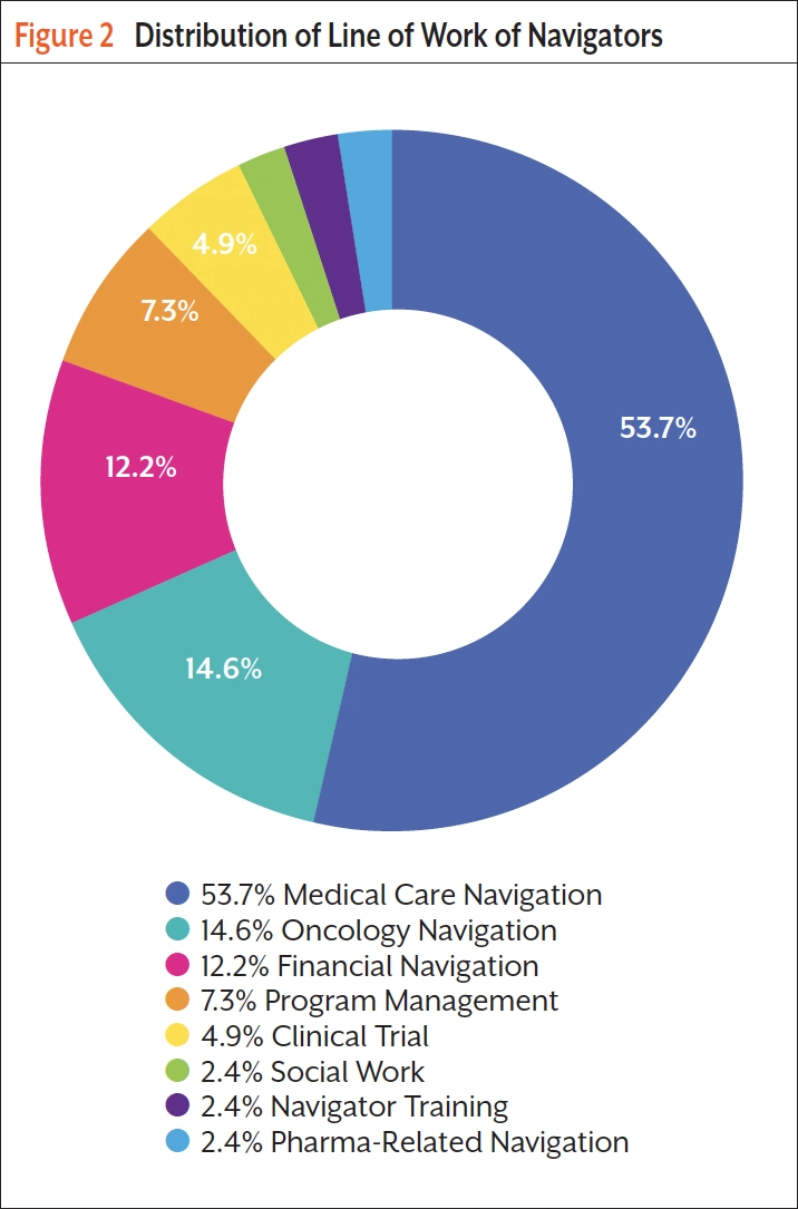Navigators are responsible for different lines of work. Over half of responders are involved in medical care navigation (53.7%), followed by oncology navigation (14.6%) and financial navigation (12.2%) (Figure 2). These high-ranking responsibilities indicating navigator’ role to support care practice also reveal diversity of patient navigation beyond clinical encounters in the continuum of care.