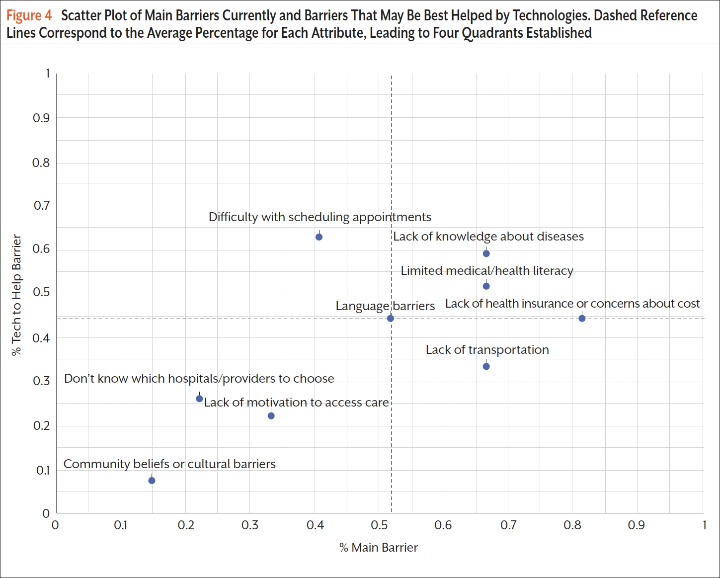 The scatter plot shows that these 2 attributes are generally correlated, with barriers aligned along the diagonal line. Language barriers are seen as the most typical challenge, with nearly half of the responders indicating that it is both a main barrier and a barrier that could be helped by technology (Figure 4). The scatter plot can be further divided into 4 quadrants using language barriers as a reference line.