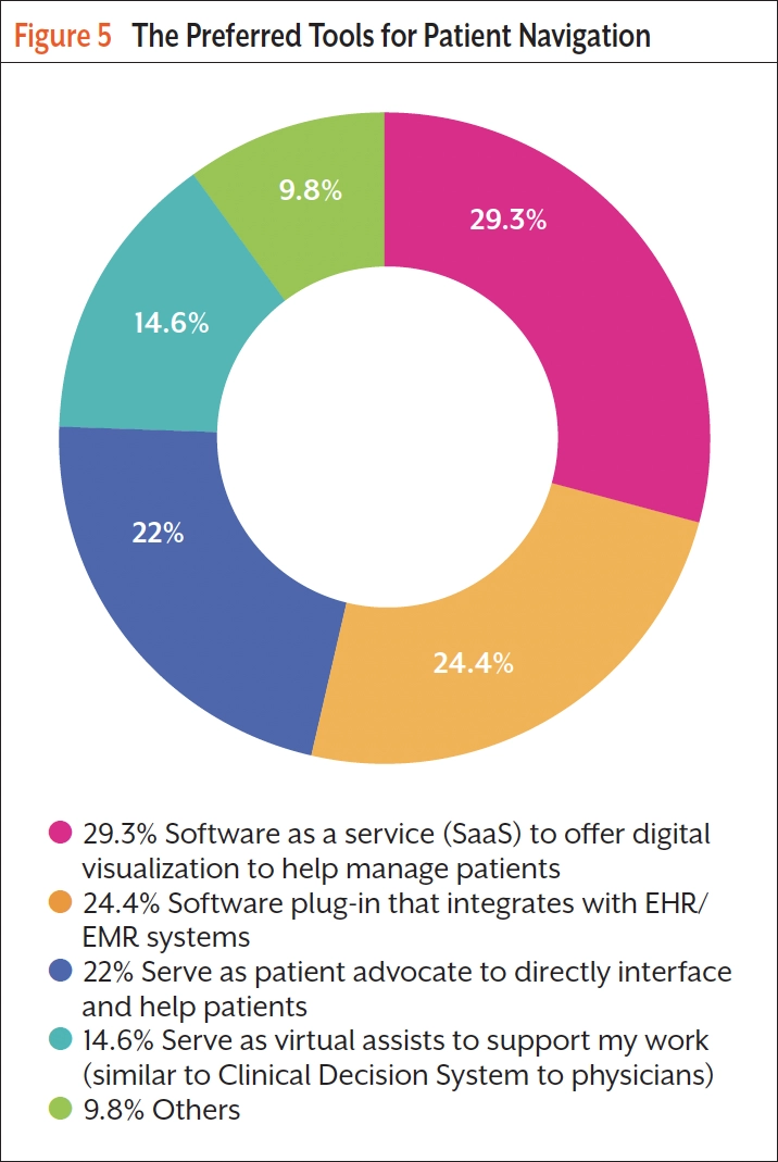 There is no consensus among respondents regarding their preferred navigation tools. The options provided in the survey included: direct patient advocate (serving as a patient advocate to directly interface and help patients), virtual assistant (serving as a virtual assistant to support the navigator’s work, like a clinical decision system for physicians), software as a service (a platform offering digital visualization to help manage patients), and software plug-in (software that integrates with electronic health record [EHR]/electronic medical records [EMR] systems). Responders were also given the option to provide self-defined answers.