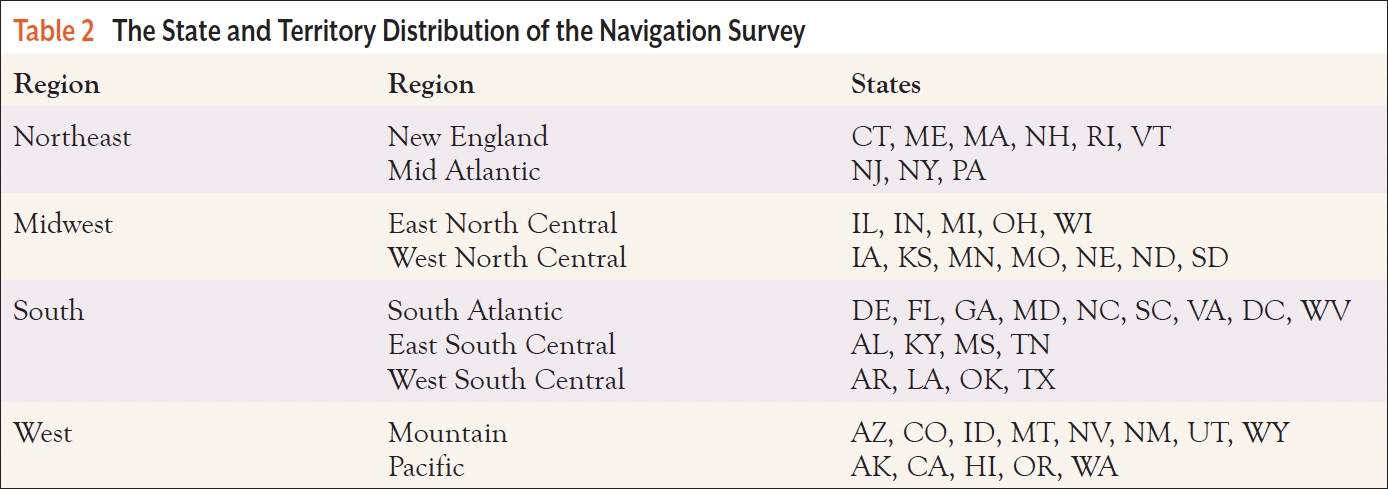 The survey was sent to 383 patient navigation professionals from 128 cities from 51 states and territories. In total, 47 respondents responded to this anonymous survey (Table 2).