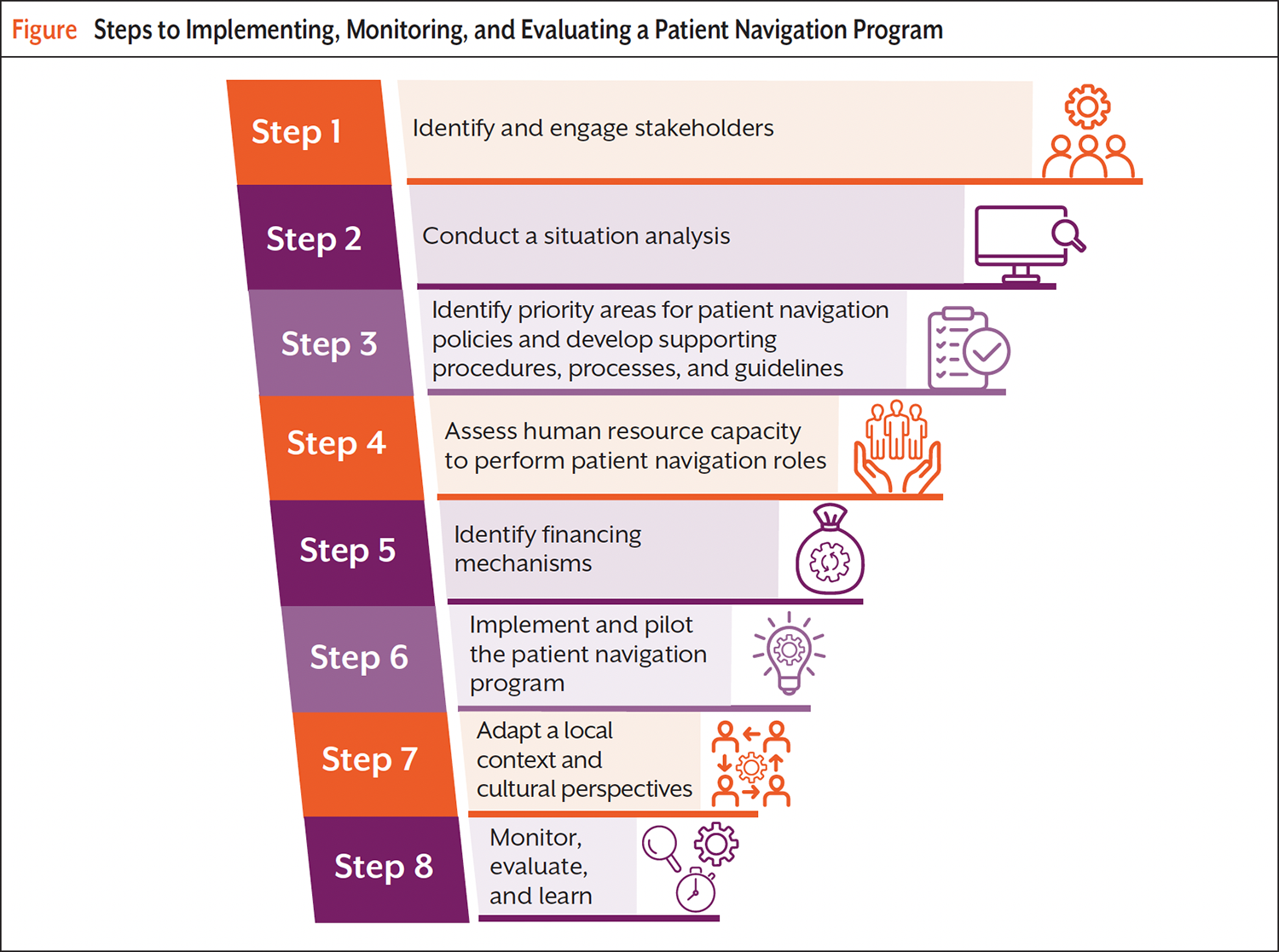 In 2024, the World Health Organization (WHO) published a technical brief to summarize patient navigation evidence and provide guidance for implementing patient navigation in the context of breast cancer screening, detection, and treatment.1 The Figure shows the key steps for implementing, monitoring, and evaluating a patient navigation program according to WHO.