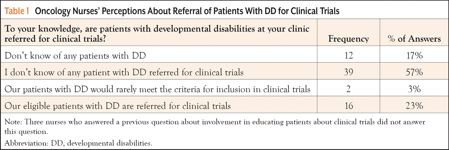 Only 16 nurses indicated that to their knowledge, eligible patients with DD were referred for clinical trials (Table 1). Among the nurses who answered the question about those who were referred, 7 were aware of patients with DD who participated, and 1 reported that patients with DD were not interested in participating in clinical trials. The remainder responded that they did not know whether any of their patients with DD participated in clinical trials. One nurse added the following: “I had a cognitively delayed patient who qualified for a research trial; however, research team dismissed this patient as a candidate because ‘they wouldn’t be able to understand or consent.’”