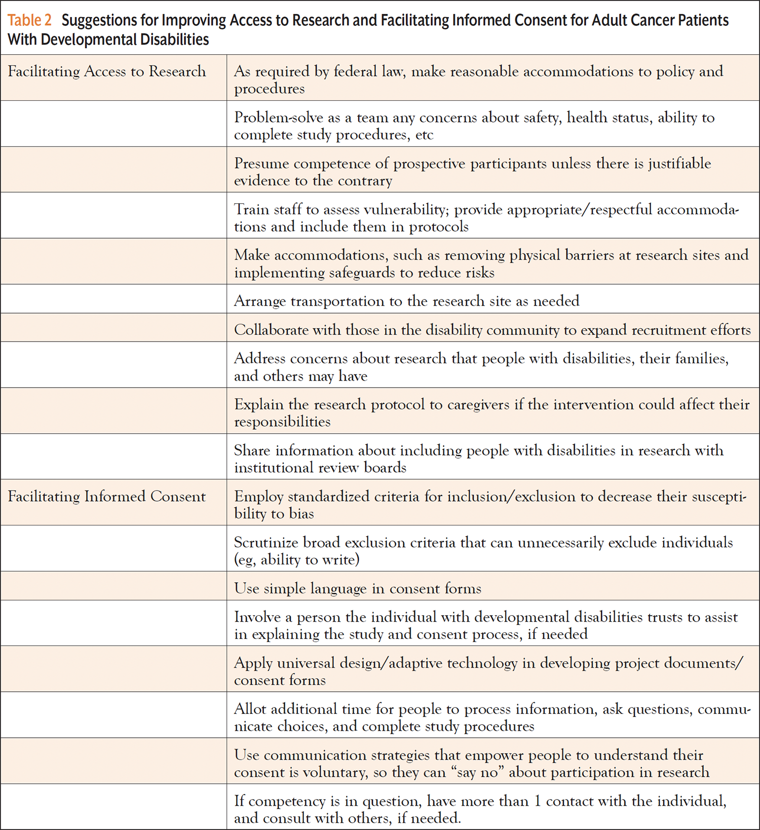 As reflected in the NCCN guidelines,9 one aspect of quality patient care is access to clinical trials, which should be designed to promote broad representative patient enrollment. Nevertheless, although clinical trials are essential for evaluating new treatments to improve patients’ care, participation in clinical trials remains relatively low. In addition, disparities in clinical trial participation can result in unequitable translation of research findings to practice, and targeted strategies are needed to reach diverse patient populations. The National Cancer Institute10 has reported that 70% of people look to their healthcare providers for information about clinical trials, but providers may be reluctant to include adult patients with disabilities in clinical trials because of concerns about their ability to provide informed consent or their ability to engage in studies’ procedures.11 In a review of clinical trials funded by the National Institutes of Health (NIH) from 2018 to 2021, researchers found that the eligibility criteria in 75% of the identified studies directly or indirectly excluded adults with intellectual disabilities.12 Indirect exclusion—perceived as opposed to objectively assessed inability to participate—was found in nearly 65% of the studies. For example, the common requirement that study participants must be able to read and write English may exclude not only those whose first language is not English, but also those with some intellectual disabilities. The review’s authors concluded that excluding individuals presumed to lack the capacity to provide consent is rarely scientifically justified. In a review of 2374 clinical trials registered from 2010 to 2020, Camanni et al13 found that those with emotional and behavioral disabilities followed by those with intellectual disabilities were most likely to be excluded. More recently, Agaronnik et al14 reported that among clinical trials listed on ClinicalTrials.gov between 2019 and 2023, researchers often excluded cancer patients with more restrictive functional status than the draft Food and Drug Administration guidelines. None of the studies they reviewed listed accommodations they had made so that people with disabilities could participate.