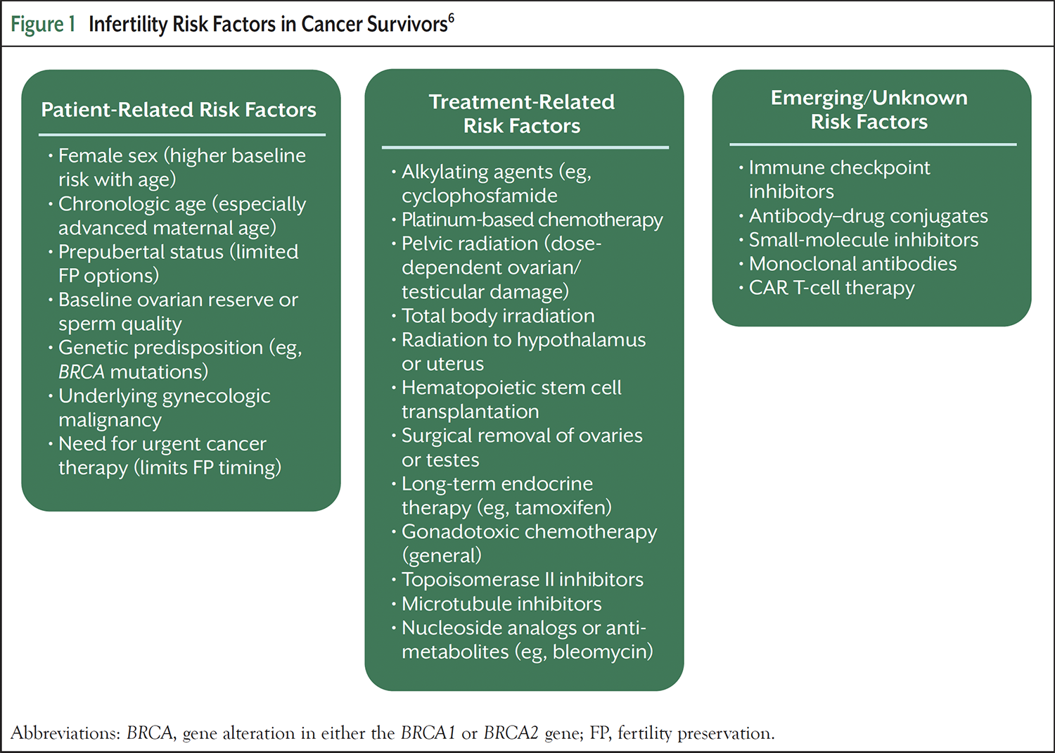 As curative treatments continue to improve outcomes for AYAs, attention is increasingly turning to survivorship issues—chief among them, preserving fertility. However, the likelihood of infertility is not uniform.4-9 A useful framework categorizes infertility risk factors into 3 domains: patient-related, treatment-related, and emerging or uncertain risks (Figure 1).6