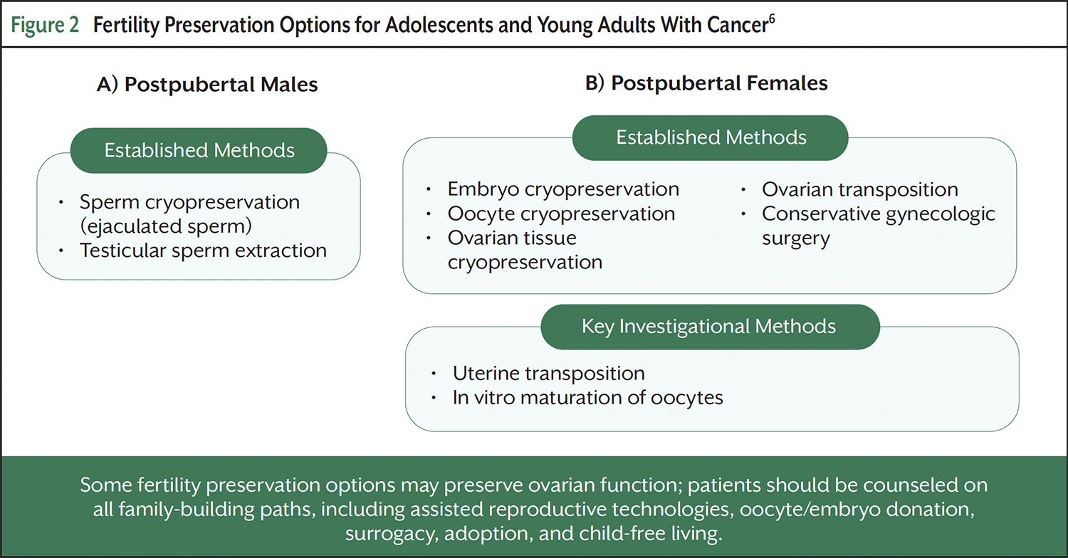For individuals assigned female at birth who have reached puberty, established FP options include embryo and oocyte cryopreservation, ovarian tissue cryopreservation, ovarian transposition, and conservative gynecologic surgery (Figure 2).6 In vitro maturation of oocytes is an emerging method that may be considered in select cases.6 FP after treatment may be cautiously considered in survivors who did not preserve gametes beforehand or who require additional material to meet family-building goals, but only if ovarian reserve is adequate and after thorough counseling about uncertain outcomes and potential risks.6,8