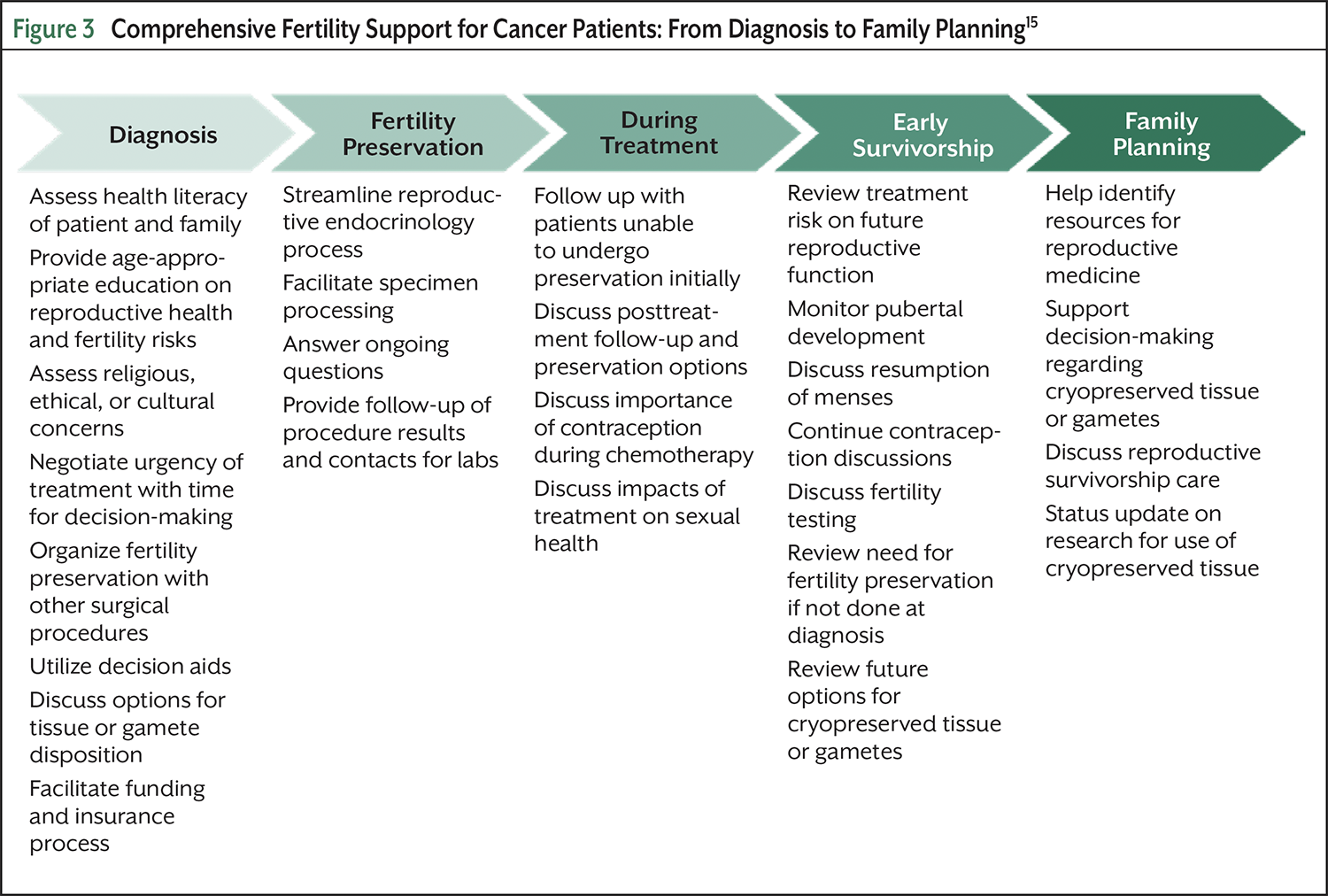 While cancer diagnoses are typically made in hospital or oncology settings, family practice clinical NPs also fulfill critical roles across the care continuum. They often serve as the first point of contact in community-based settings and maintain long-term relationships with patients during survivorship. NPs are well-positioned to reinforce or revisit fertility discussions that may have been rushed or overlooked during the acute diagnostic phase. They can assess reproductive health, refer to fertility specialists, and support family-building goals posttreatment. In rural or underserved areas, NPs can also serve as first-line educators and advocates, especially when also trained as OPNs.