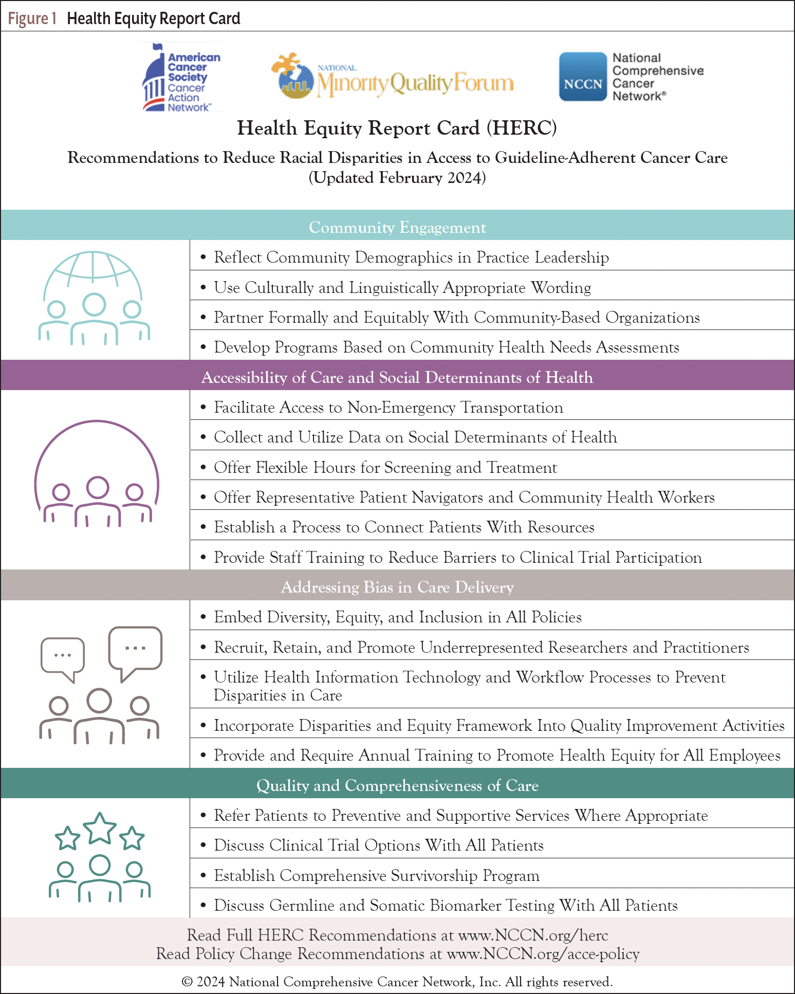 The NCCN, a nonprofit alliance of 33 cancer centers, is dedicated to defining and advancing quality, effective, equitable, and accessible cancer care and prevention for all. Their work includes the development of a reliable, evidence-based tool for providers and institutions, the Health Equity Report Card, to measure and incentivize more equitable cancer care practices.