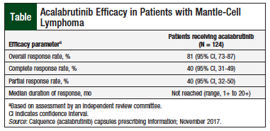 Most patients (median age, 68 years) were male (80%) and Caucasian (74%).8 The median time since the diagnosis of mantle-cell lymphoma was approximately 46 months. Patients who received acalabrutinib had received a median of 2 previous therapies for mantle-cell lymphoma (range, 1-5), most often chemotherapy-based treatment with cyclophosphamide, doxorubicin hydrochloride, vincristine sulfate, and prednisone, or with cytosine arabinoside.8