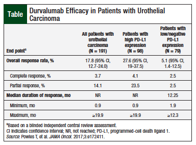9. Powles T, O’Donnell PH, Massard C, et al. Efficacy and safety of durvalumab in locally advanced or metastatic urothelial carcinoma: updated results from a phase 1/2 open-label study. JAMA Oncol. 2017;3:e172411.