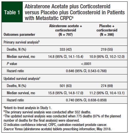 Study 1 included 1195 patients (median age, 69 years) who were randomized in a 2:1 ratio to abiraterone acetate once daily, at a dose equivalent to 500 mg of the fine-particle abiraterone acetate formulation, in combination with a different oral corticosteroid twice daily, or placebo plus oral corticosteroid twice daily. Overall, 90% of patients had bone metastases and 30% had visceral involvement.8 Patients who received abiraterone acetate demonstrated a significant (P <.0001) 3.9-month longer median survival in the primary analysis and a 4.6-month longer median survival in the updated survival analysis compared with placebo (Table 1).8