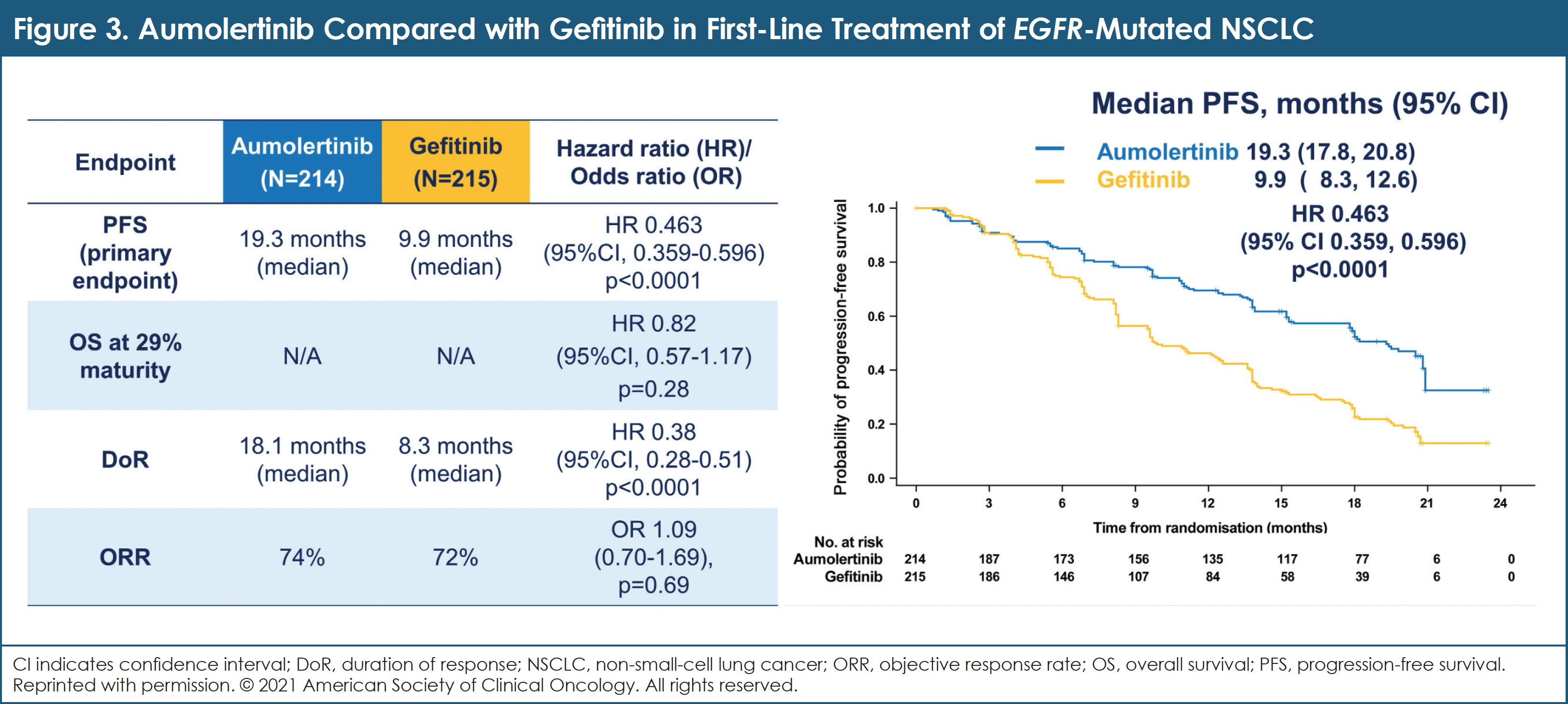 Patients with previously untreated metastatic or locally advanced NSCLC and EGFR exon 19 deletion or L858R were randomly assigned in a 1:1 ratio to receive either aumolertinib (110 mg once daily) or gefitinib (250 mg once daily). The primary end point of this study was PFS by RECIST version 1.1 per investigator assessment. At 262 PFS events, the study had 90% power to detect a PFS HR of 0.67. Secondary end points included OS, ORR, DOR, and safety.11