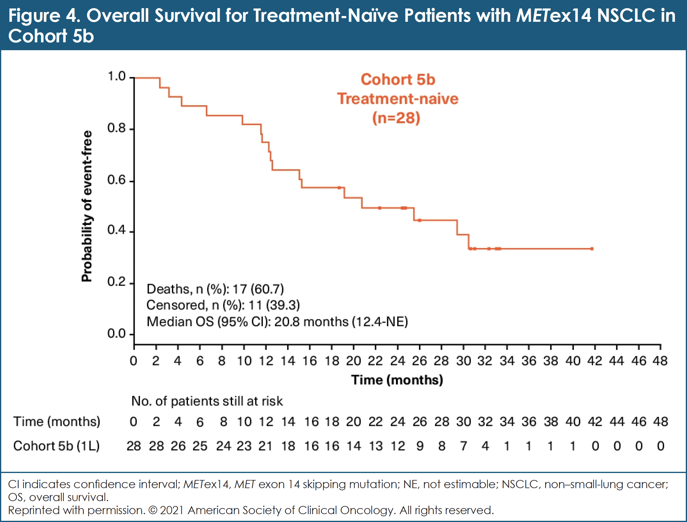As of November 8, 2018, 97 patients with MET exon 14–mutated NSCLC were evaluable for efficacy: 69 patients in cohort 4; 28 patients in cohort 5b.14 In cohort 4, the overall response rate by BIRC was 40.6% (95% CI, 28.9%-53.1%).14 In cohort 5b, the overall response by BIRC was 67.9% (95% CI, 47.6%-84.1%).14 While still immature at the time of this analysis, data regarding DOR are promising: median DOR (95% CI) by BIRC was 9.7 months (5.6-13.0) and 8.4 months (12.6-not estimable) for cohorts 4 and 5b, respectively.14 Median PFS (95% CI) by BIRC was 5.4 months (4.2-7.0) and 12.4 months (8.2-23.4) for cohorts 4 and 5b, respectively.14 Mature median OS was 20.8 months (95% CI, 12.4-not estimable) in cohort 5b and 13.6 months (95% CI, 8.6-22.2) in cohort 4.14 (See Figure 4.)