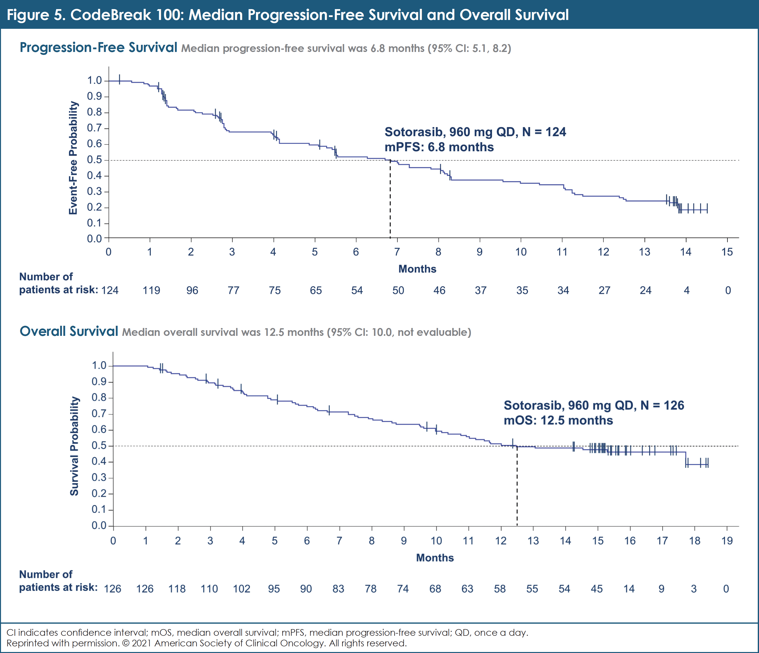 In the CodeBreaK 100 trial, sotorasib was given orally at 960 mg once daily to eligible patients who had advanced NSCLC harboring KRAS G12C and who had received prior standard therapies. The study’s primary end point was ORR assessed by central review. Key secondary end points included PFS, OS, and safety.18
