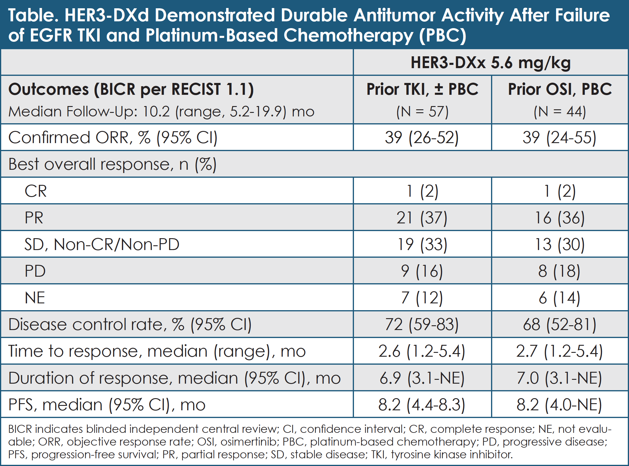 Median duration of treatment with HER3-DXd was 5.7 months (range, 0.7-28.3), and treatment with HER3-DXd was ongoing in 18 (32%) patients.29 The confirmed ORR for HER3-DXd by BICR was 39% (95% CI, 26%-52%), including 1 CR and 21 PRs.29 Sixteen of 22 responses occurred within 3 months of starting HER3-DXd.29 The DCR was 72% (95% CI, 59%-83%).29 Median DOR was 6.9 months (95% CI, 3.1 months-not evaluable).29 Median PFS was 8.2 months (95% CI, 4.4-8.3).29 Among patients who received platinum-based chemotherapy and osimertinib, the ORR was 39% (95% CI, 24%-55%).29 (See Table.)