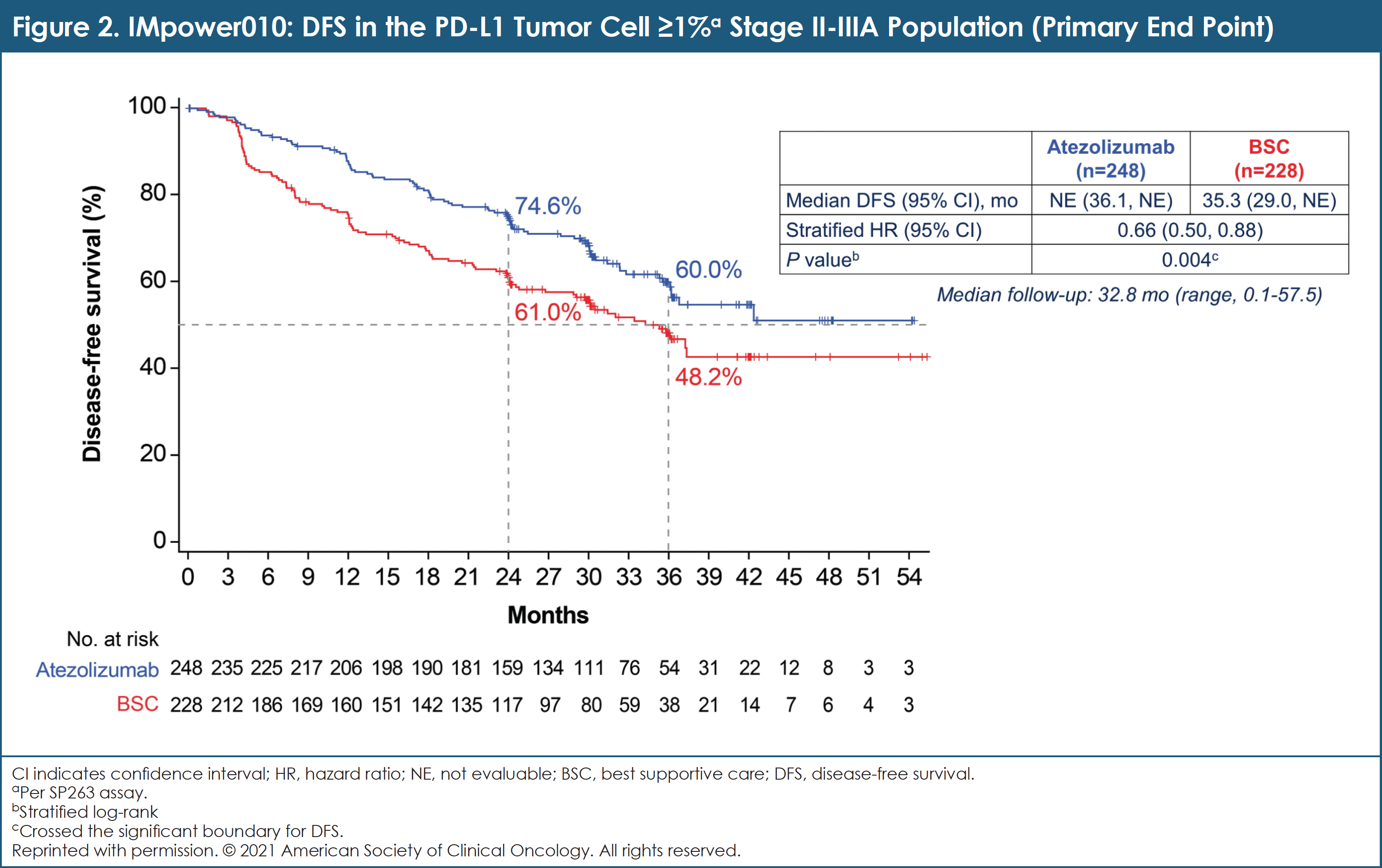 In patients with fully resected, high-risk, early-stage NSCLC, adjuvant platinum-based chemotherapy provides only a modest 5-year survival benefit. At the 2021 ASCO Annual Meeting, researchers reported disease-free survival (DFS) results from the preplanned interim analysis of IMpower010, a randomized, phase 3, open-label trial of adjuvant atezolizumab (anti–PD-L1) compared with best supportive care (BSC) after adjuvant chemotherapy in patients with early-stage resected NSCLC.4