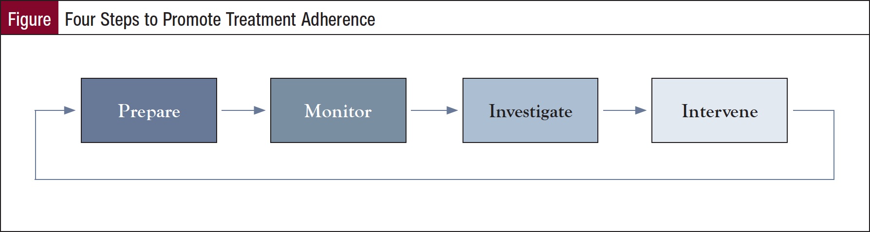 Achieving better adherence among patients with multiple myeloma requires a comprehensive approach that begins before treatment. This strategy can be divided into 4 steps: (1) prepare, (2) monitor, (3) investigate, and (4) intervene. Keep in mind that this is a cyclical process, as shown in the Figure. If a patient has a regimen adjustment, or starts a new phase of treatment, then it is necessary to begin again by preparing the patient for the next leg of their treatment journey.