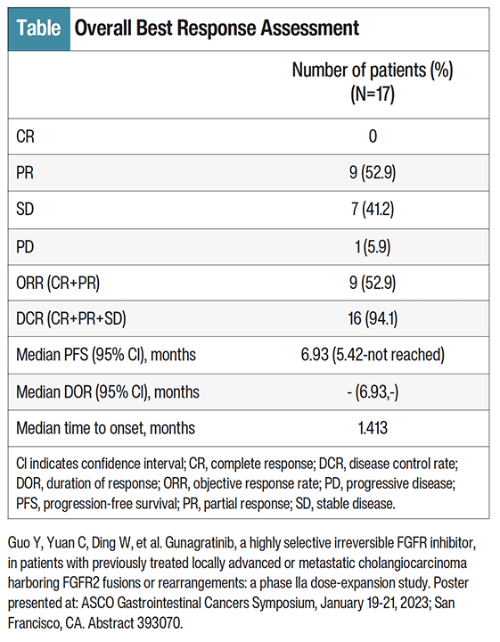 At ASCO Gastrointestinal Cancers Symposium 2023, Ye Guo, MD, presented results from an ongoing phase 2a dose-expansion study of gunagratinib in patients with CCA.