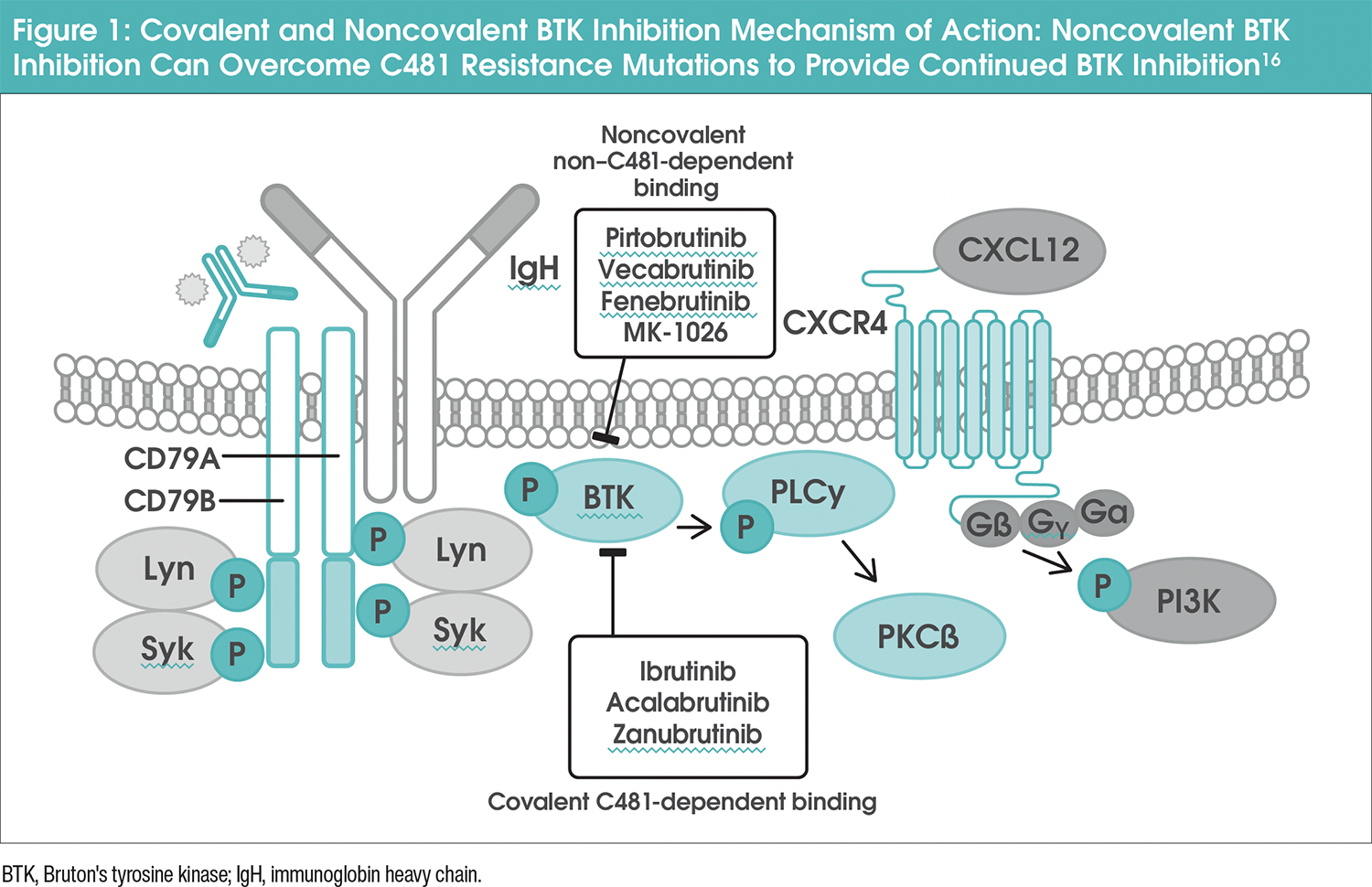 Inhibiting the Bruton’s tyrosine kinase (BTK) domain interferes with multiple pathways important for CLL cell survival, proliferation, and migration.10,11 Noncovalent inhibitors interact with BTK through reversible binding, unbinding, and rebinding, offering an alternative mechanism of inhibition.12-14 Pirtobrutinib is a highly selective, noncovalent (reversible) BTKi that can target both the wild-type (unmutated) and mutated BTK protein (Figure 1).15,16 It achieves 96% BTK target inhibition at steady-state plasma levels and has a half-life of approximately 20 hours.15 Unlike covalent BTKis, pirtobrutinib stabilizes BTK in a closed, inactive conformation, making it effective against resistant mutations and offering a promising alternative for patients with CLL or other B-cell malignancies.11,12,15,17