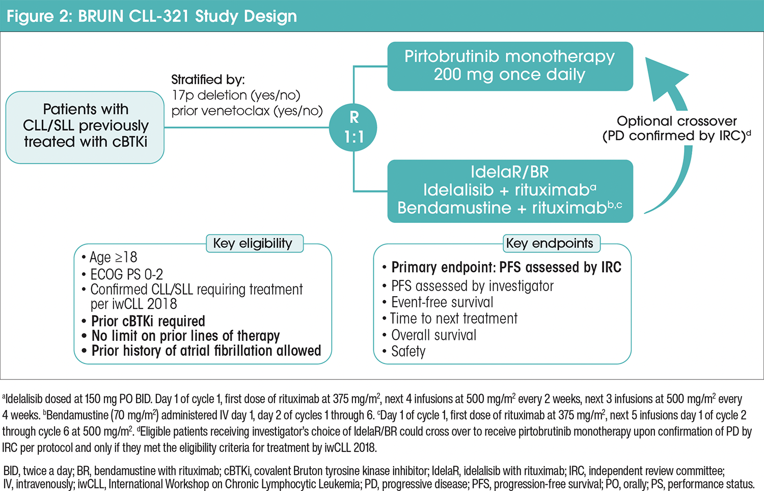 Eligible patients were randomly assigned 1:1 to receive either pirtobrutinib or investigator’s choice (IC) of idelalisib with rituximab (IdelaR) or bendamustine with rituximab (BR; Figure 2). Patients could cross over from IC to pirtobrutinib upon progressive disease (PD) confirmation by independent review committee (IRC), and only if they met the eligibility criteria for treatment.4