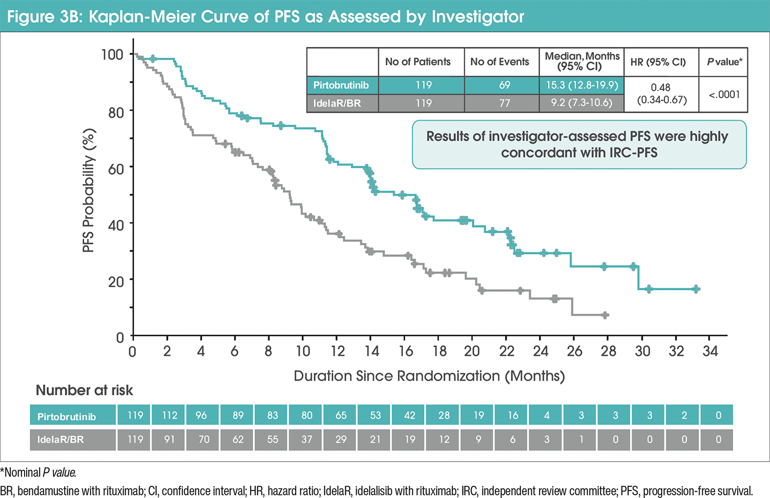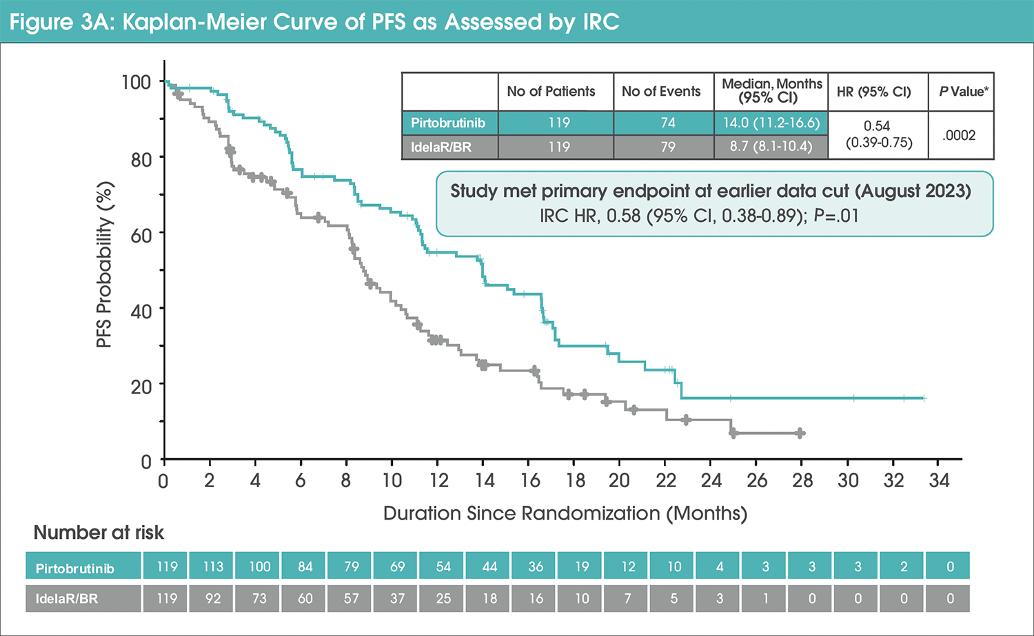 Median IRC-PFS in the pirtobrutinib group was 14 months (95% confidence interval [CI], 11.2-16.6) versus 8.7 months (95% CI, 8.1-10.4) with IdelaR/BR (hazard ratio [HR], 0.54 [95% CI, 0.39-0.75]; nominal P=.0002; Figure 3A).4 The median investigator-assessed PFS was 15.3 months (95% CI, 12.8-19.9) in the pirtobrutinib group and 9.2 months (95% CI, 7.3-10.6) in the IdelaR/BR group (HR, 0.48 [95% CI, 0.34-0.67]; Figure 3B).4